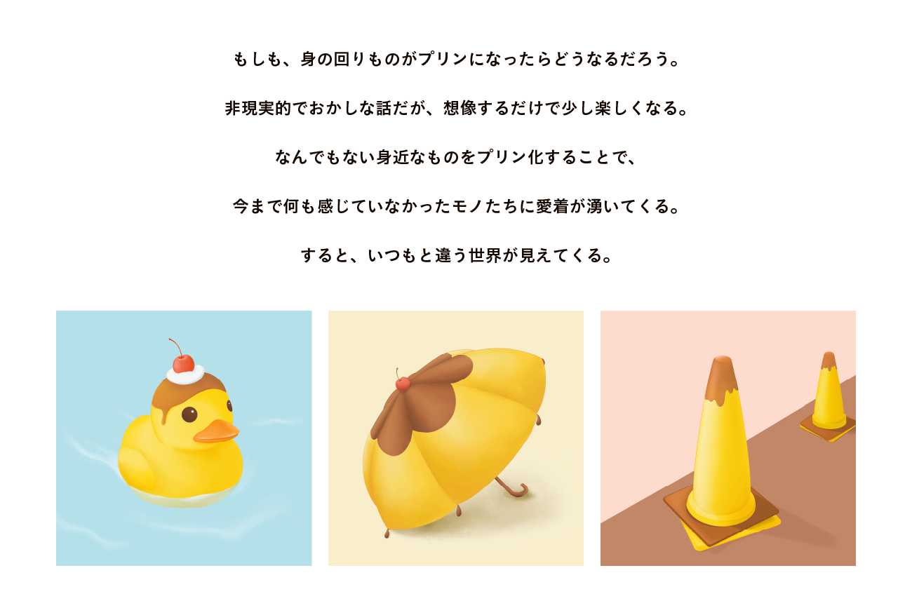 ストレスを感じ続けると、どんどん視野が狭くなってしまう。そんなとき、身近なものがプリンに見えてきたら、いつもと違う景色が見えてきて楽しくなるのではないかと考えました。
