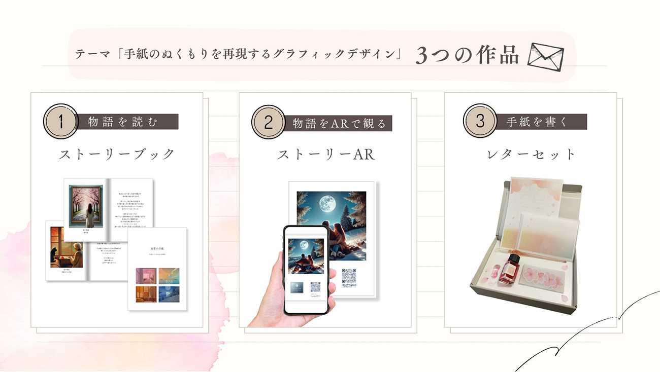 「手紙のぬくもりを再現する、グラフィックデザイン」をテーマに、物語・AR・レターセットの3つの作品を制作しました。