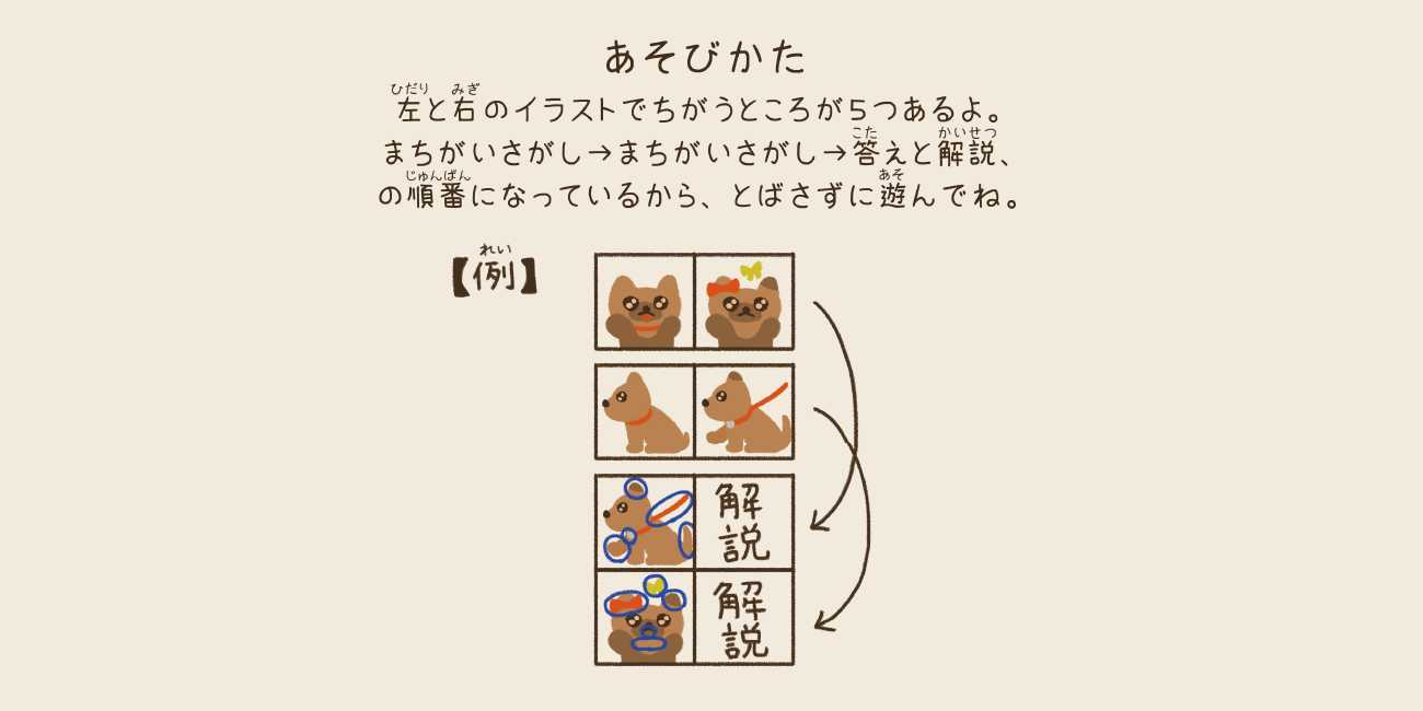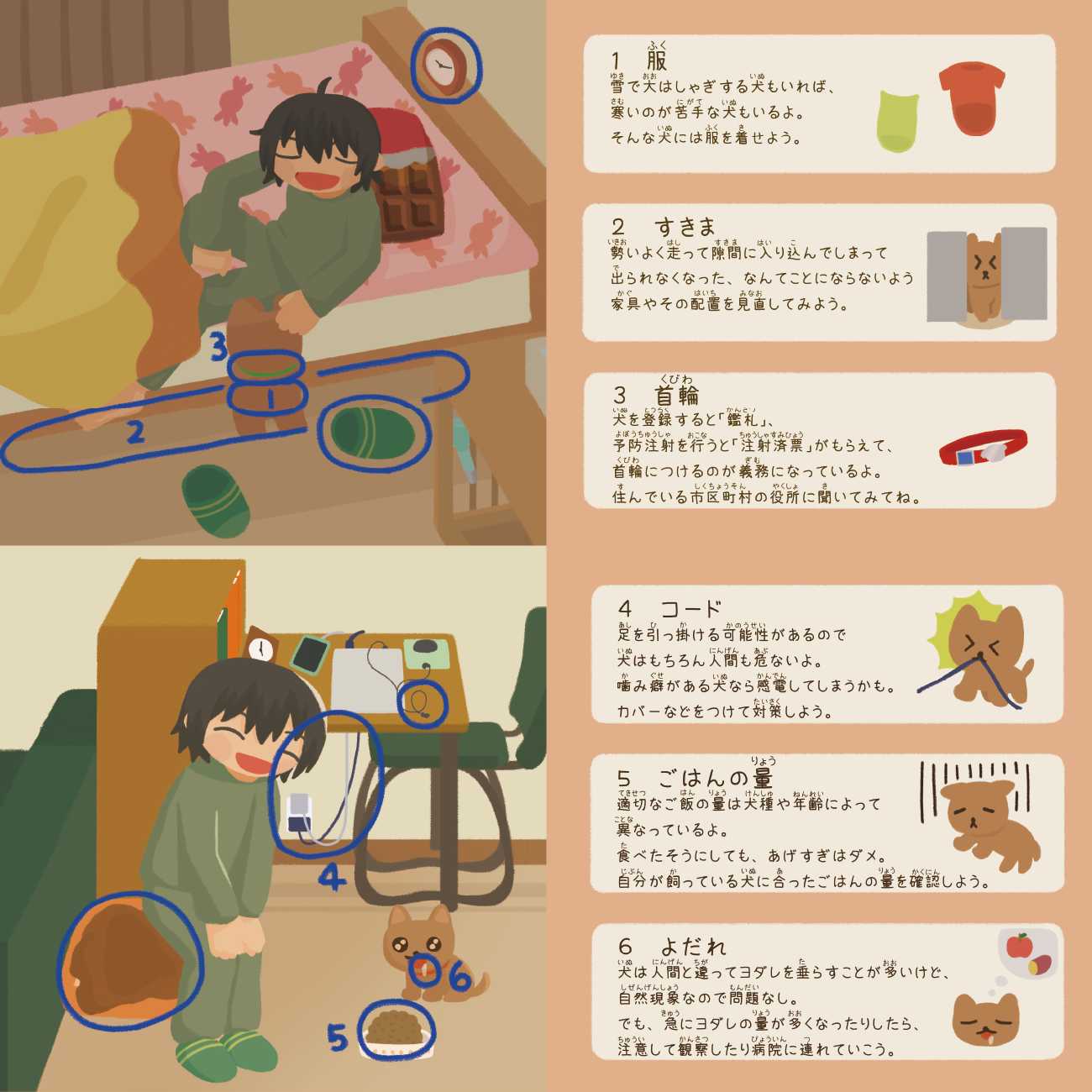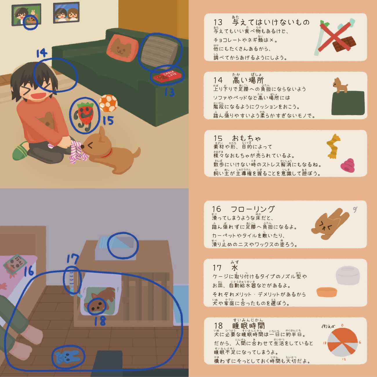 「犬」は人間と同じ、生き物。でも「犬」は人間と違う、生き物。これから犬を飼いたいと思っている人や、すでに犬を飼っている人に向けて、その2つを改めて確認してほしくてこの作品を制作しました。まちがいさがしを通して、大人だけでなく子どもたちにも遊びながら犬について考えてほしいです。