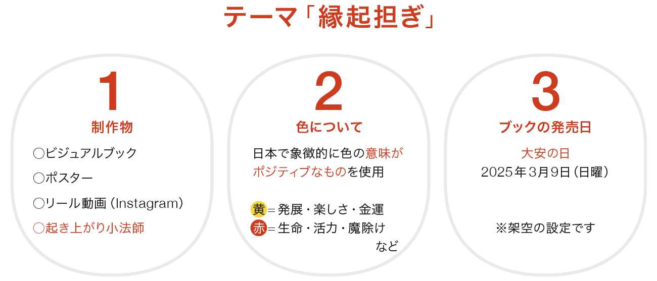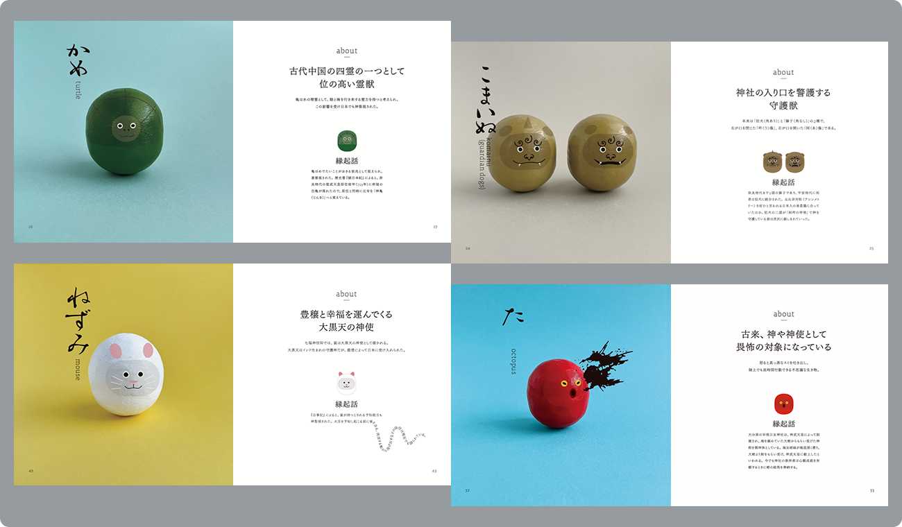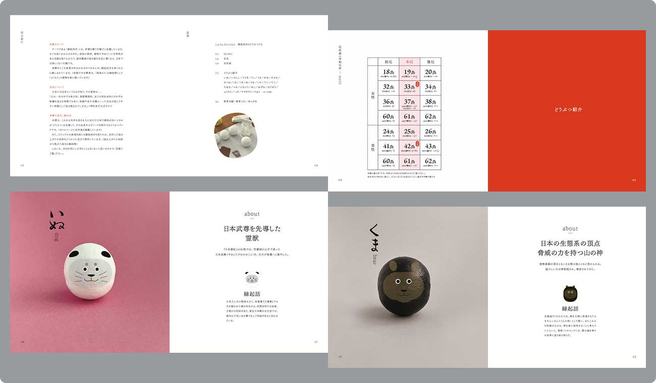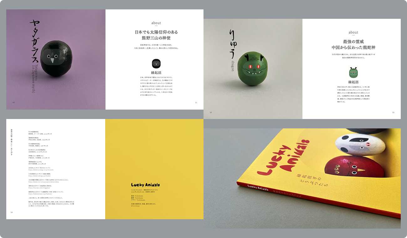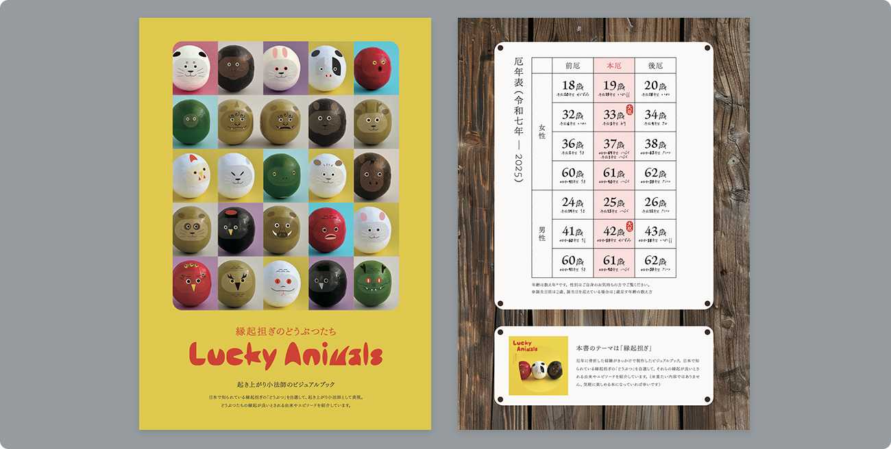 制作テーマは「縁起担ぎ」です。厄年に骨折した経験を踏まえて、これから厄年を迎える人に向けた、日本で知られている縁起担ぎのどうぶつを自選して、起き上がり小法師に見立て、それらの縁起が良いとされる由来やエピソードを紹介しています。(とはいえ、縁起担ぎのような精神的なことは気にしすぎも良くないと思いますので、気軽にご覧いただけるような本を目指しました)