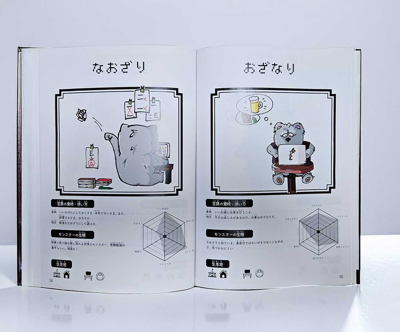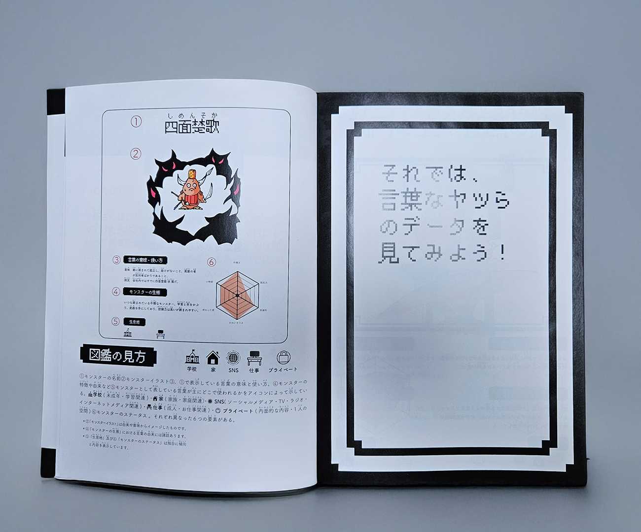 言葉の本来の意味や由来を知ることを目的とし、ことわざ、四字熟語、慣用句などをモンスター化し、図鑑として制作しました。文字だけでまとめるのではなく、視覚的にも印象に残りやすくし、より言葉に興味を持っていただけるよう工夫しました。