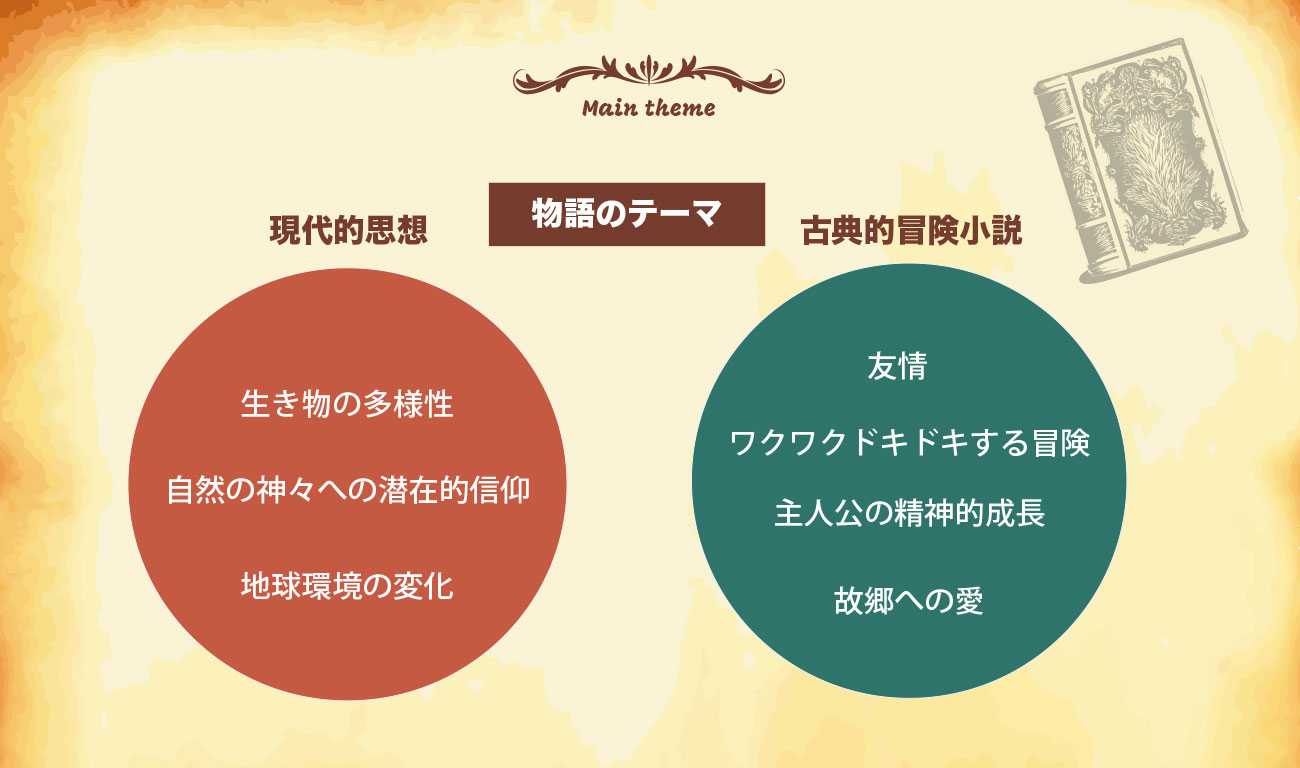 物語のテーマに古典的冒険小説のセオリーにのっとりながら「生き物の多様性」「自然の神々への潜在的信仰」「地球環境の変化」を入れ込みました。