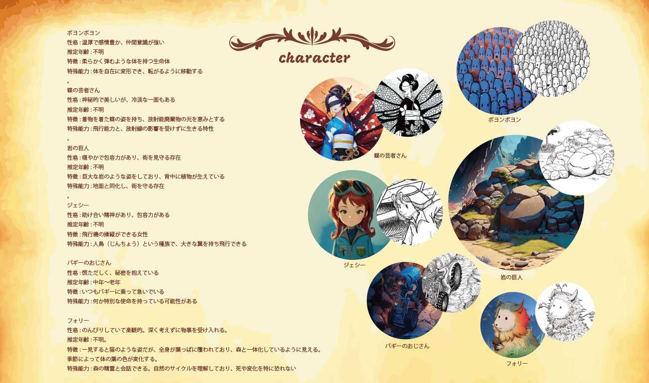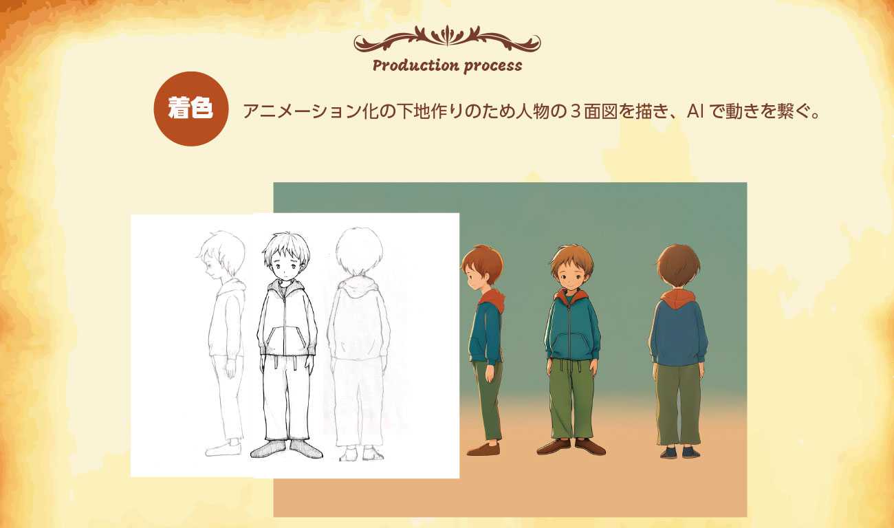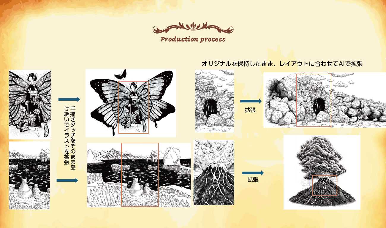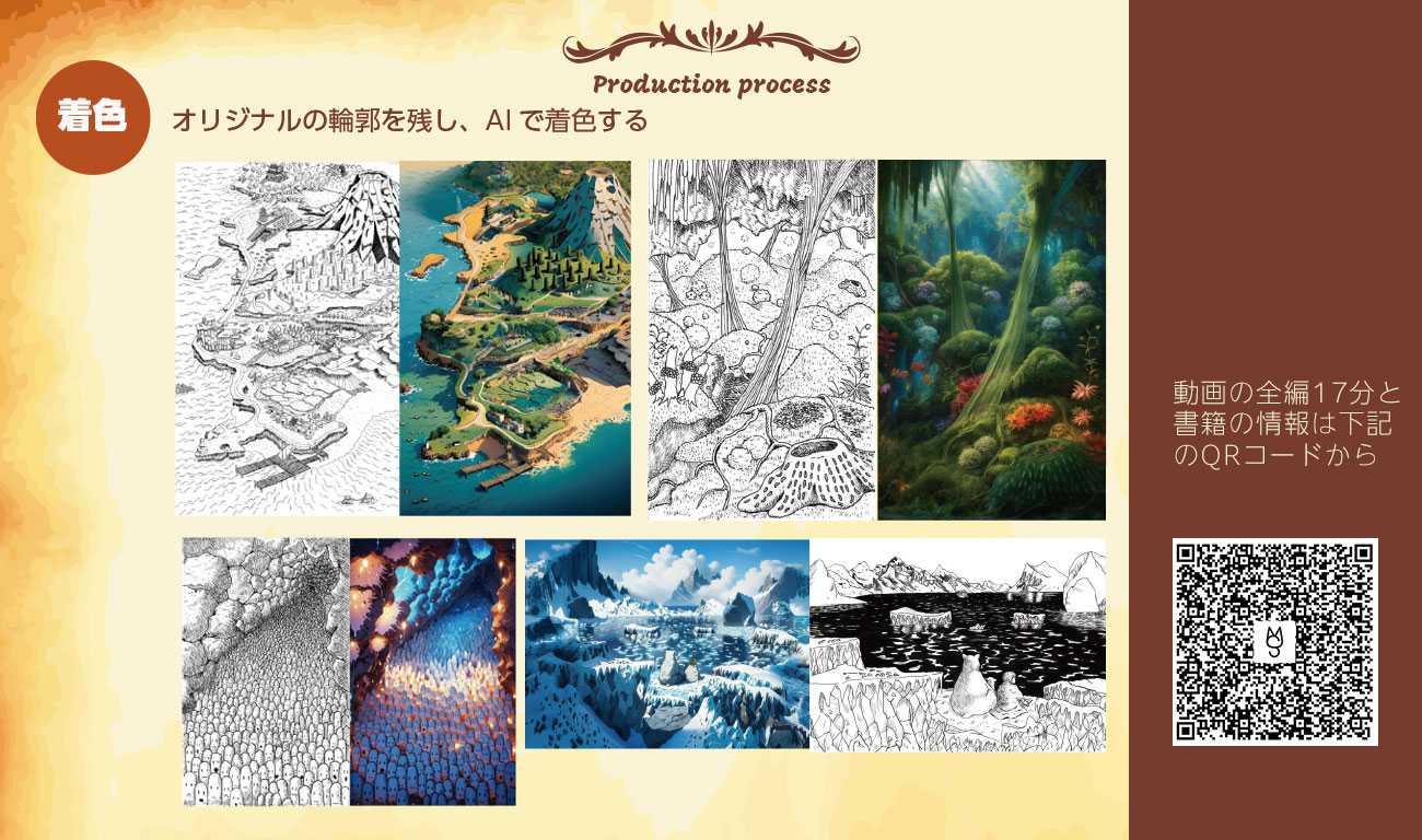 最初にオリジナルのイラストレーションを0.03ミリの手描きのペン画で創作。着色はオリジナルのイラストレーションのアウトラインを基にAIで着色している。書籍のなかのペン画はオリジナルのイラストを残したままそれを拡張する形でAIで書き足しをしているものがある。