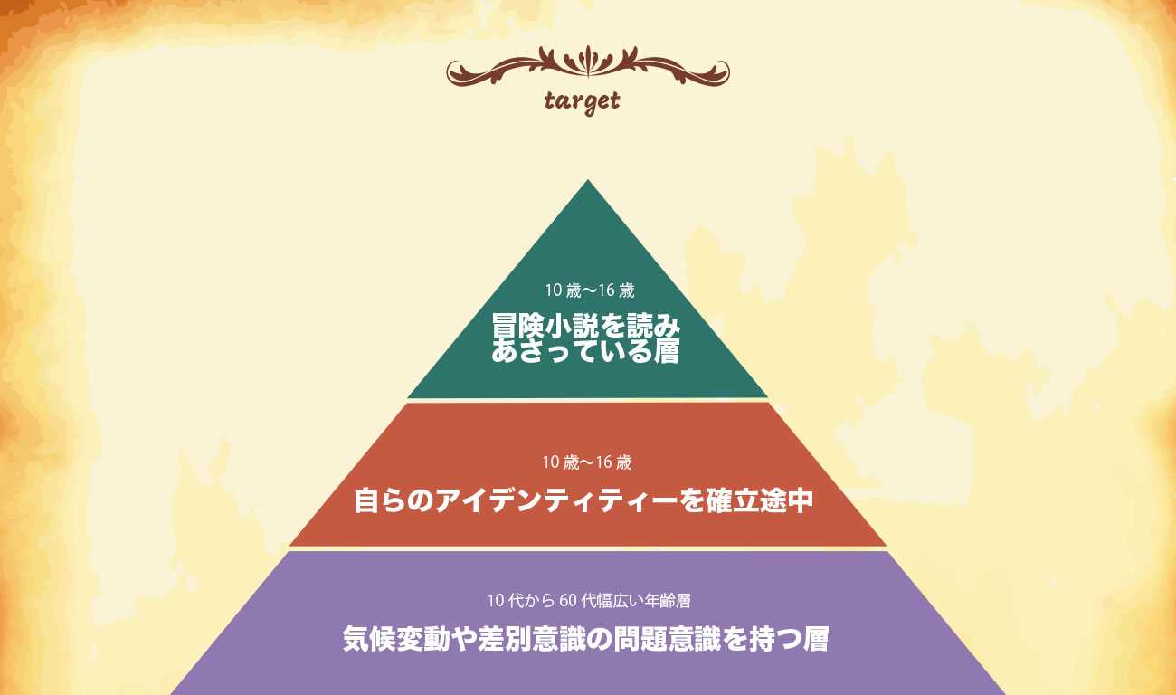 物語の読者層は主人公と同じ自分のアイデンティティーを探している真っ最中の冒険好きな年代をコアにしましたが、問題意識を持つ広い層にも関心を持ってもらえることを前提にしています。