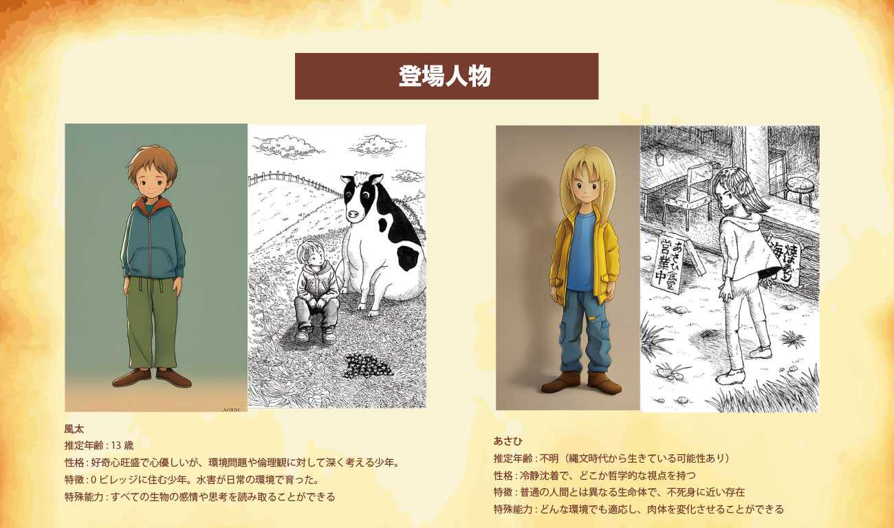 主人公は生き物すべての心が感じ取れる13歳の少年と数千年も生きている不死身の少年です。手描きタッチを維持したままAIで着色しています。