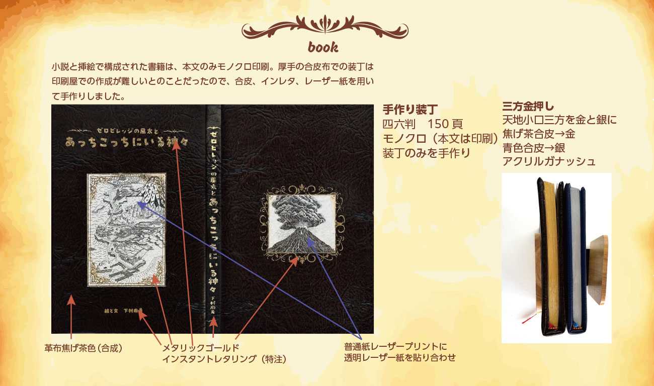 書籍の装丁は合皮を使用、小口の三方金はアクリルガッシュで手作りの豪華本を2冊作りました。本文は業者にお願いして150頁四六判で印刷しました。
