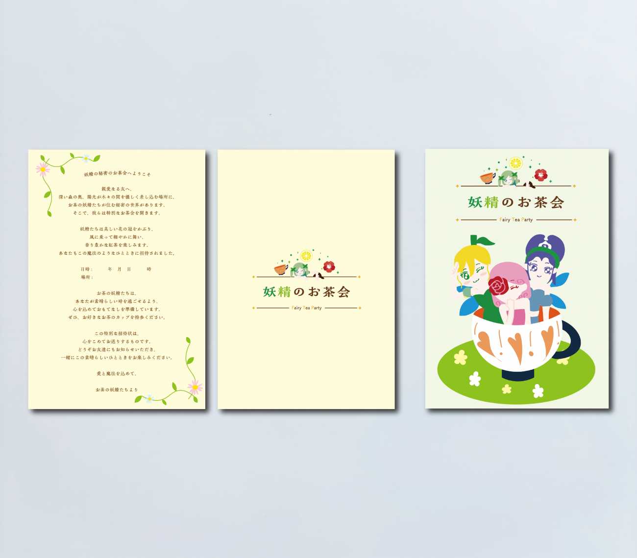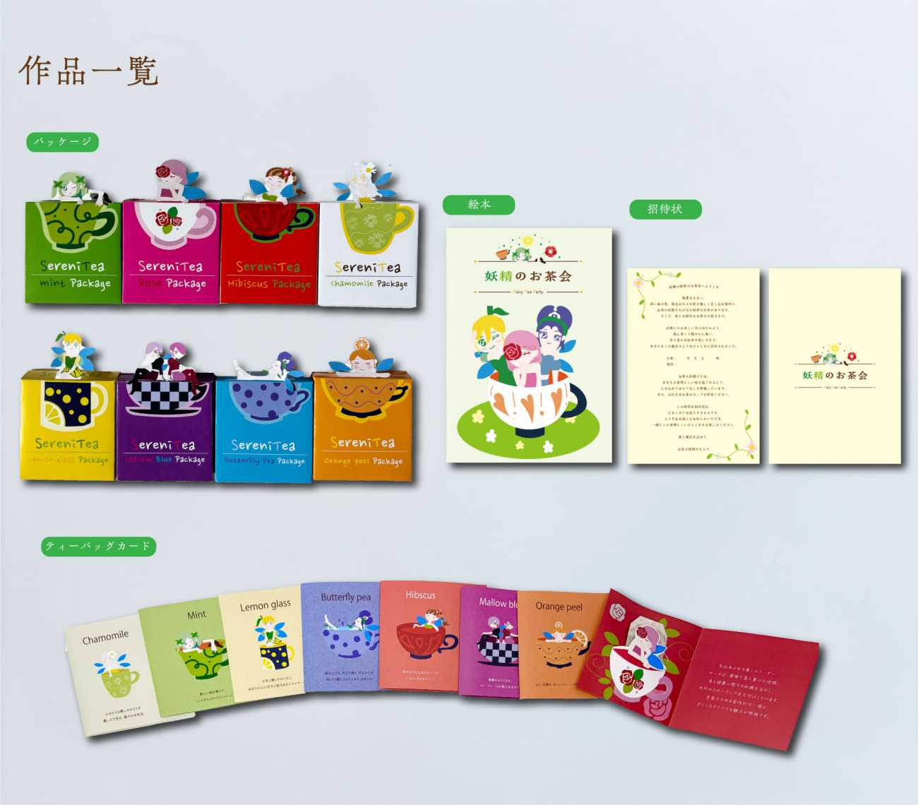 今回制作した作品一覧です。ティーバッグセットと絵本、招待状を制作しました。