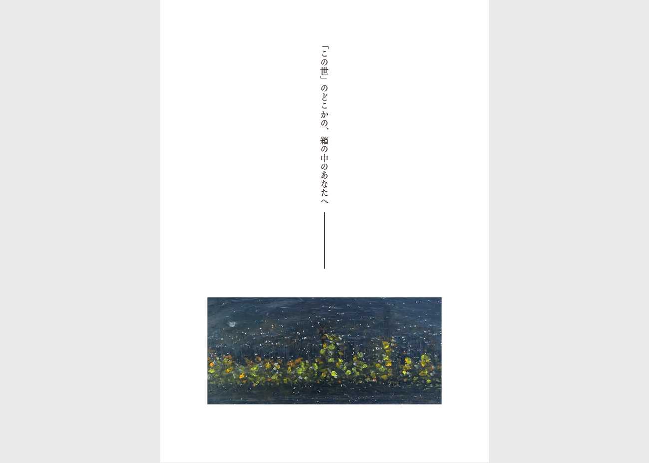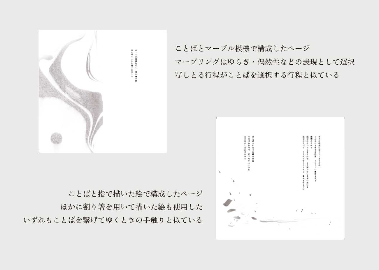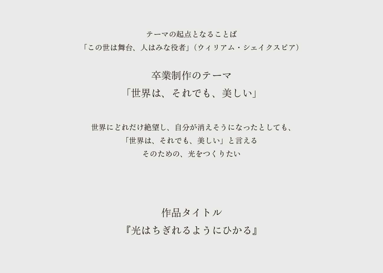 シェイクスピアの言葉「この世は舞台、人はみな役者」という一節を発端に、卒業制作のテーマである「世界は、それでも、美しい」ということばに至るまでのことばの軌跡をまとめました。「てざわり」のある本を目指し、紙の選定、書体の調整、活版印刷、マーブリングなどさまざまな工夫を凝らしました。ポスター(パネル)は作品の背景等を解説するもの、今作のためのもの、次作の予告となるものの3点を制作しました。
