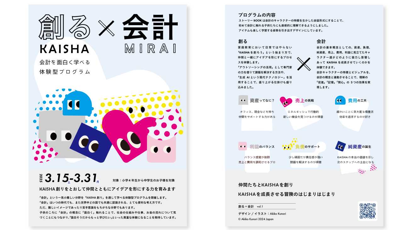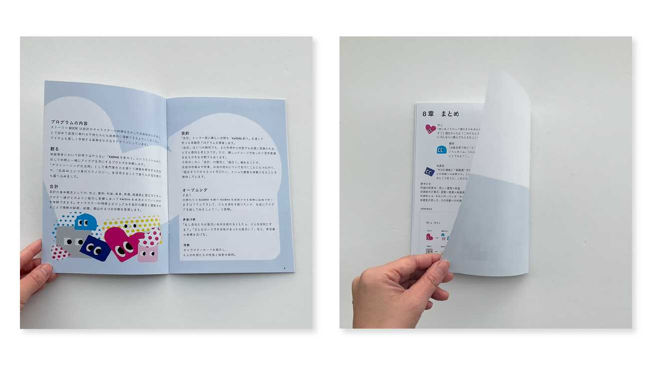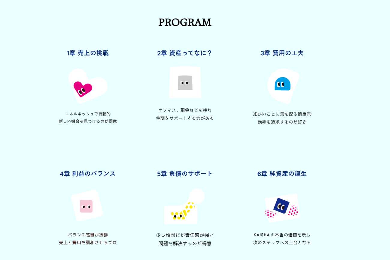 「会計」の要素をキャラクターとしてビジュアル化し、子どもたちが感情移入しやすいようにストーリー仕立てにデザインしています。