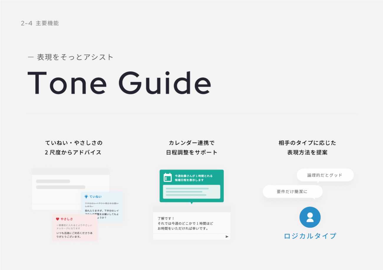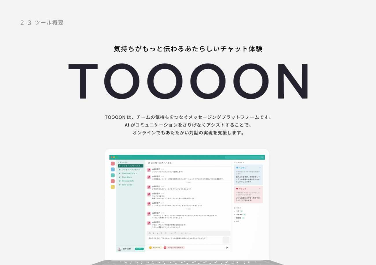 TOOOONはテキストコミュニケーションで失われがちなニュアンスの機微を正確に伝えることと、コミュニケーションの質を上げることで仕事の質も上げることを目指したビジネスチャットツールです。