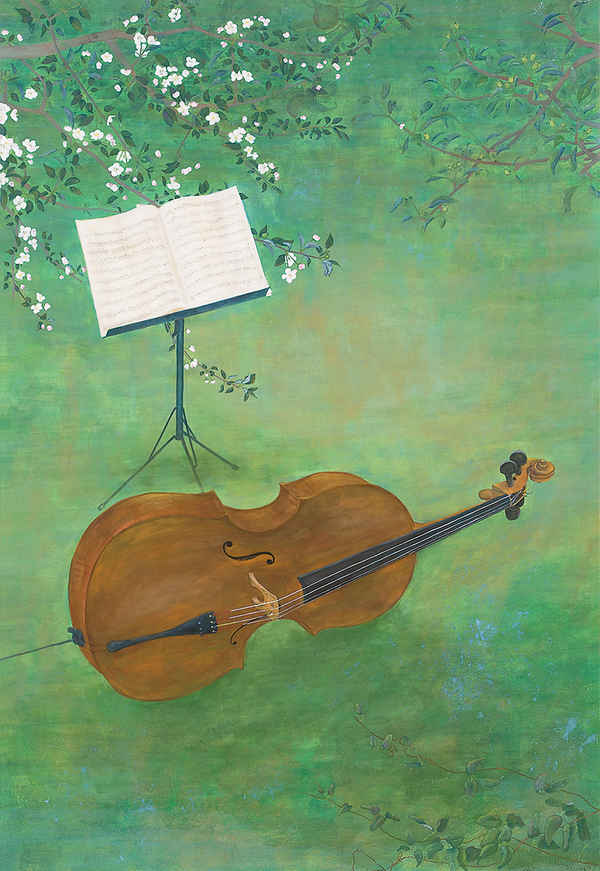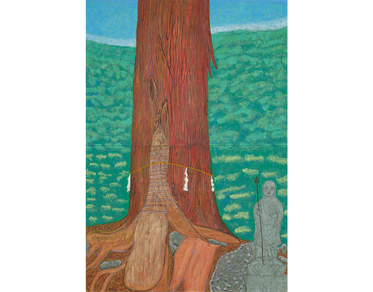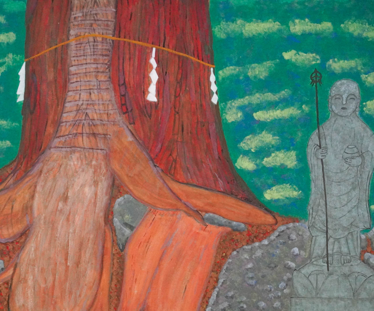 私の自宅から歩いて約20分の距離の岩屋神社の境内にある巨大な赤紫色の神木と石の地蔵さんを描きました。その思いは神木の生命力の強さと存在感を表現するとともに、地蔵さんの柔和な優しい顔を描きたいというものでした。本画を描きだすと地蔵の顔か自分自身に似てきました。