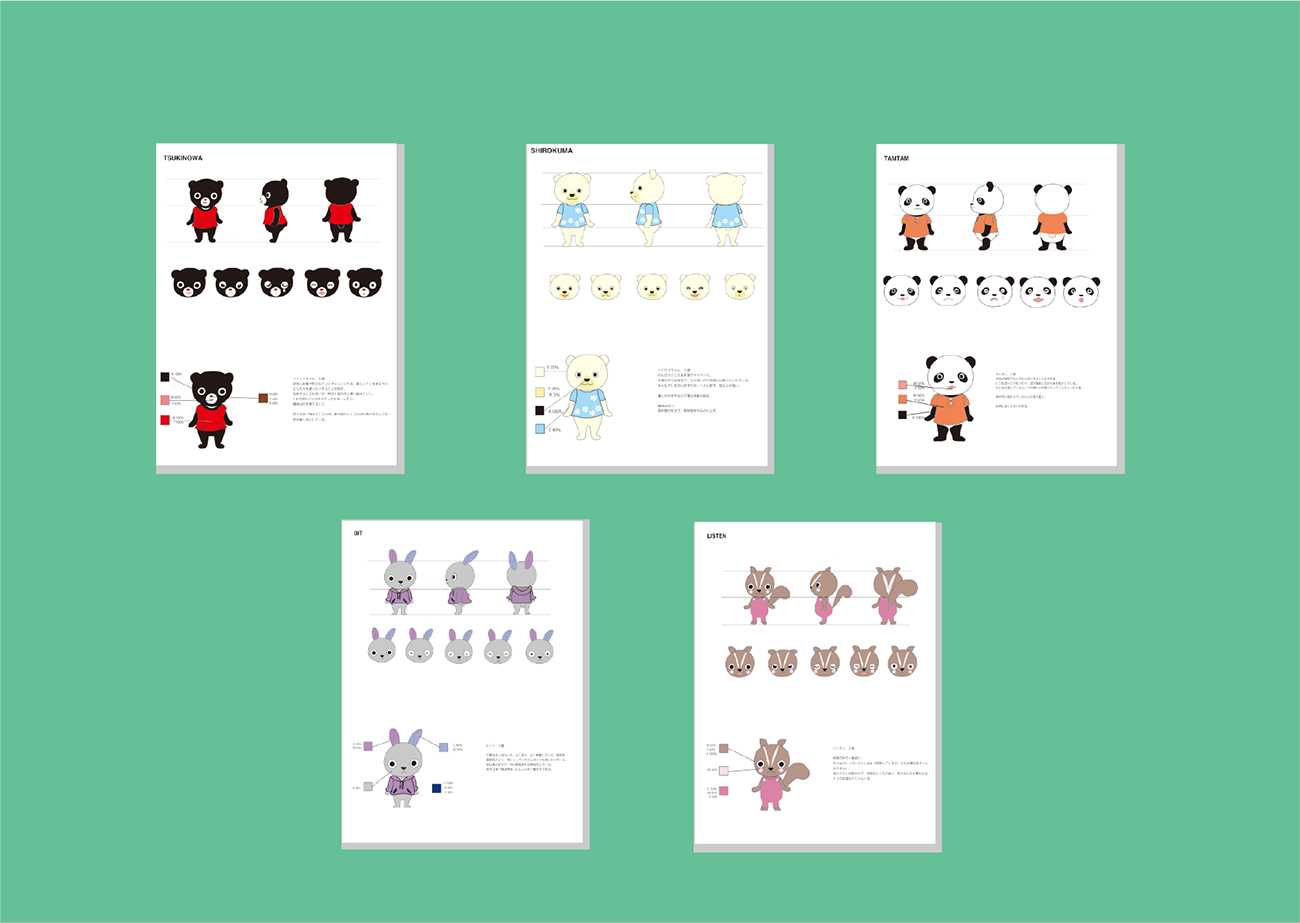 2歳〜5歳の幼児と保護者を対象に、ジェンダーレスで多様性を体現したキャラクターを策定しました。キャラクターは幼児が感情移入し、自己投影していく大切な存在です。幼い頃から自己肯定感をもち 他者や多様な文化に興味を持ってや欲しいという願いを込めてキャラクター設計しました。それぞれが得手不得手があり、互いを補完し合う特徴を持っています。