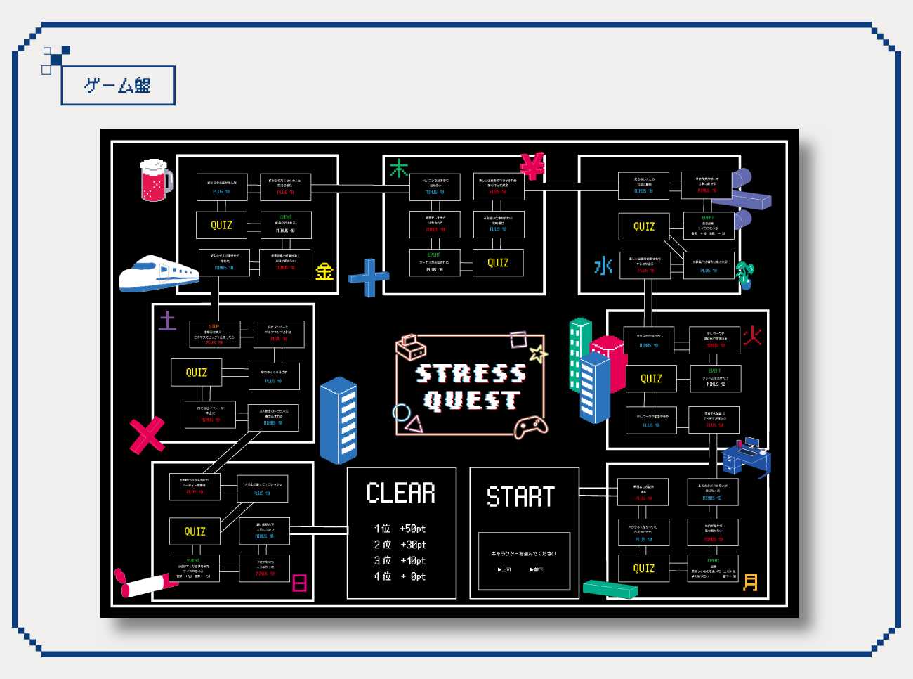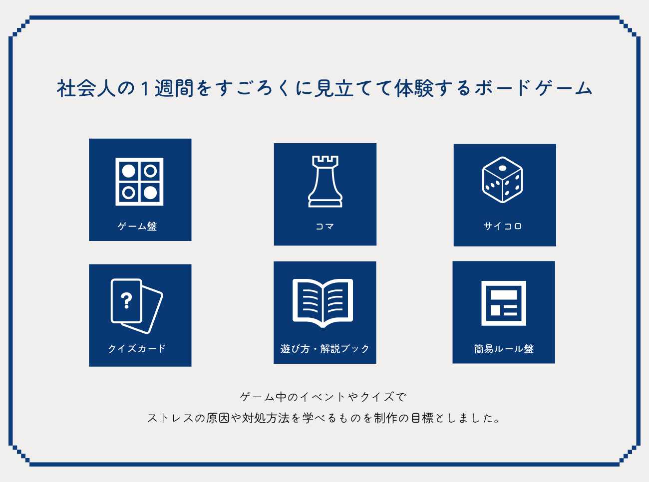 そこで「ゲームで知るストレス、メンタルヘルスの知識」をテーマにした「すごろく」を制作しました。このすごろくは、特にストレスを抱えやすい社会人を対象にしています。プレイヤーはゲーム内で社会人の1週間を体験し、日常生活の中でどのような場面がストレスの原因になるのかを学んでいきます。
