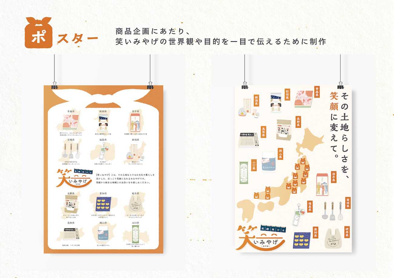 笑いみやげの全体像を1枚で伝えるポスター(右)と全国各地を舞台にしたおみやげであることを視覚的に伝えるポスター(左)を制作