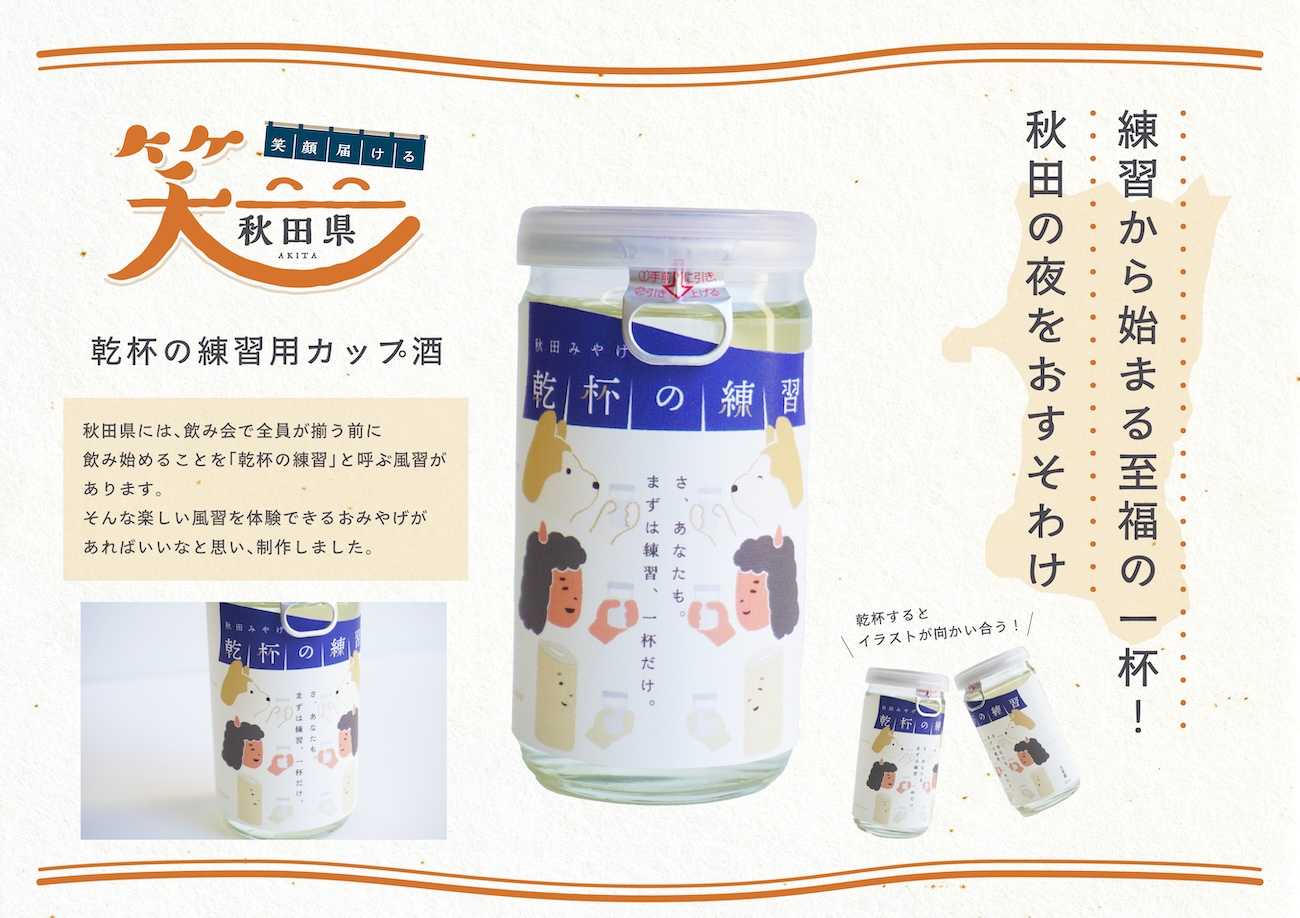 【秋田県】乾杯の際にお酒が揺れる様子をイメージし、ラベルの形状や背景、「乾杯の練習」の文字に波を打つようなデザインを取り入れました。