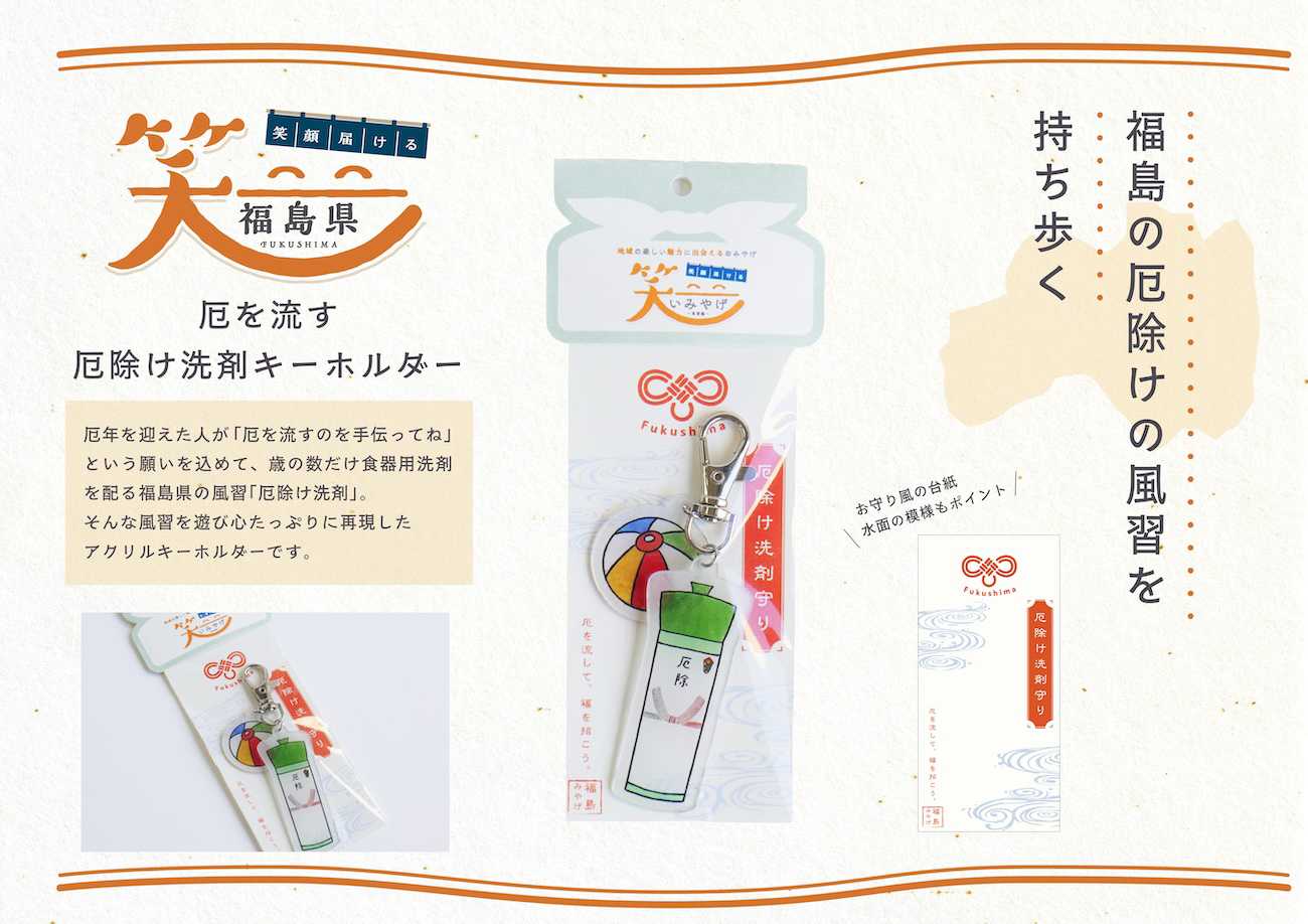 【福島県】食器用洗剤のキーホルダーというユニークさが話題のきっかけにもつながりそうな本商品。実際の風習と同じように、周りの人に配りたくなるおみやげにしました。