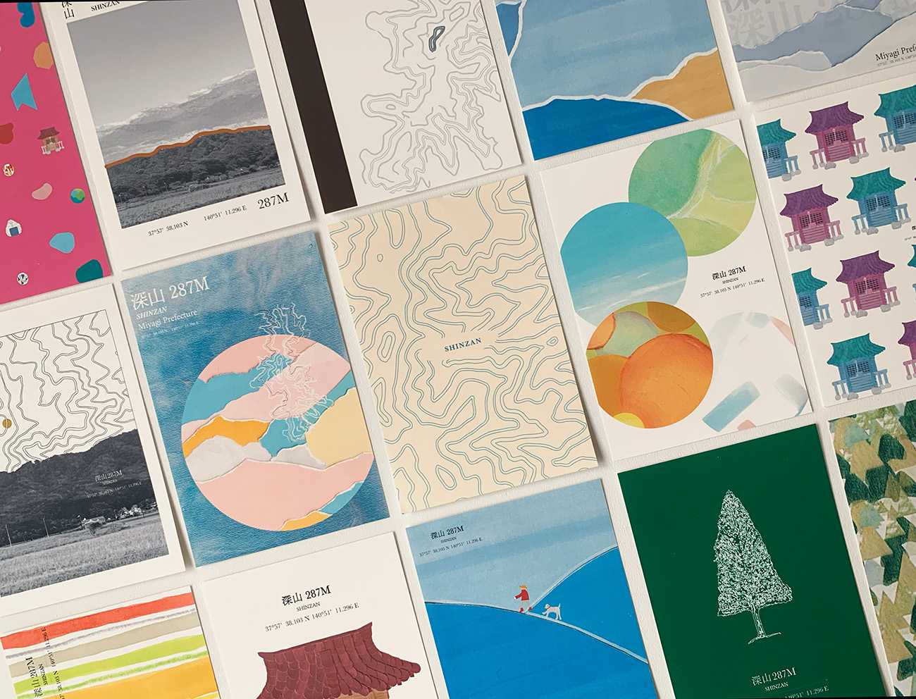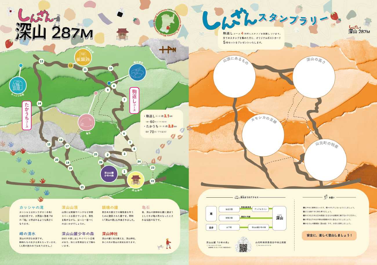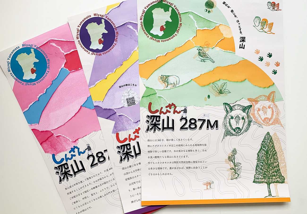 そんな深山の魅力を知っていただくために、冊子や地図掲載のリーフレット、ポスターなどの制作に加え、さらに楽しんでいただけるようスタンプラリー企画も考案しました。また、スタンプラリーに●していただいた際の景品として、風景や動植物など、さまざまなデザインのポストカードを用意しました。