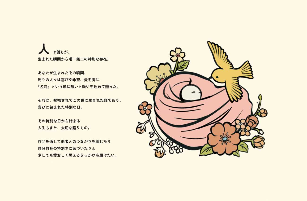 あなたが生まれたその瞬間、周りの人々は喜びや希望、愛を胸に、名前という形に想いと願いを込めて贈りました。