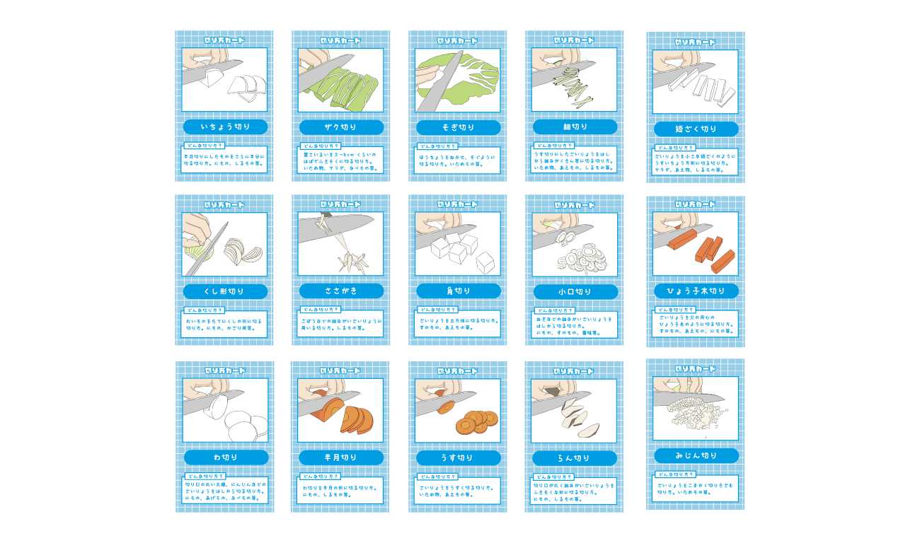 料理と野菜の切り方を関連付けて覚えていくことを目的としています。