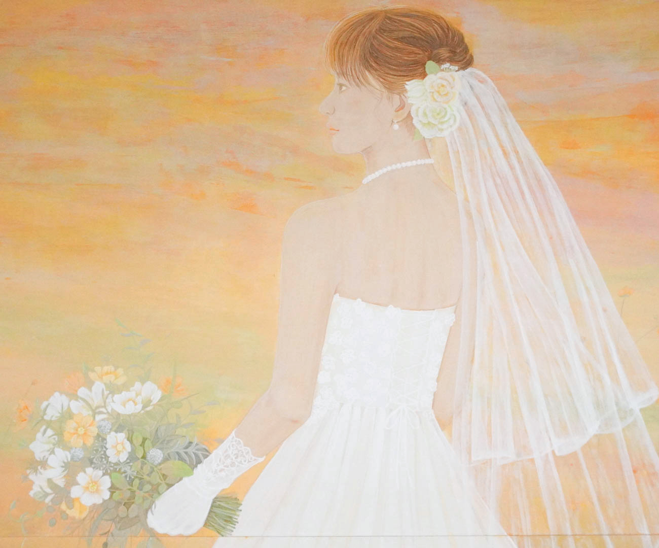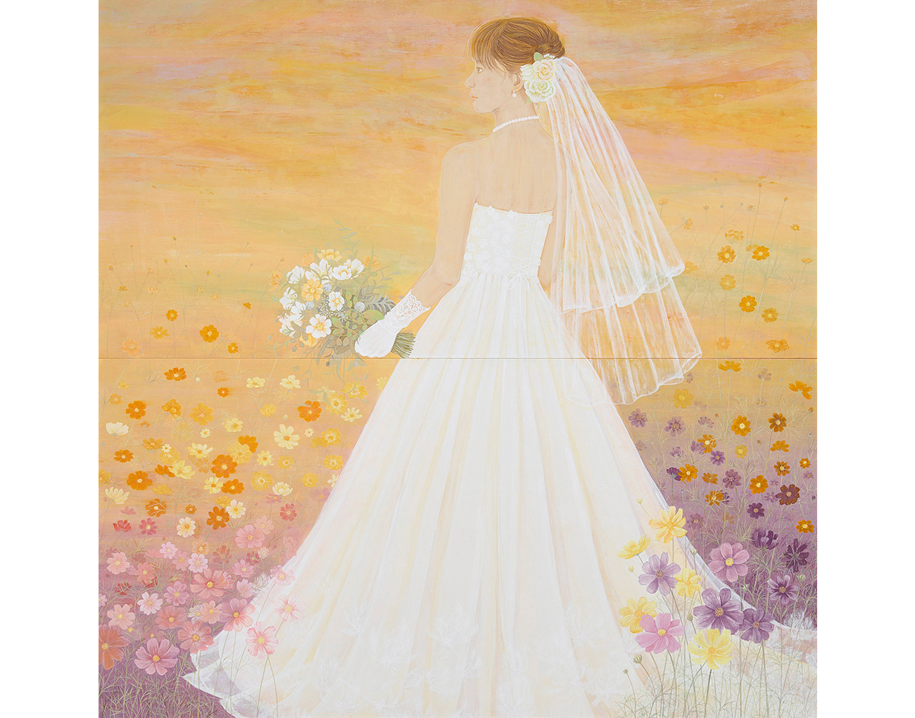 卒業制作は人物画にしようと思い、娘のウエディングドレス姿を描くことにした。全体を明るくやさしく希望あふれるイメージにしたいと考え、背景には主に温かみのある暖色系の絵の具を塗り、人物の周りには咲き誇るコスモスの花を描いた。