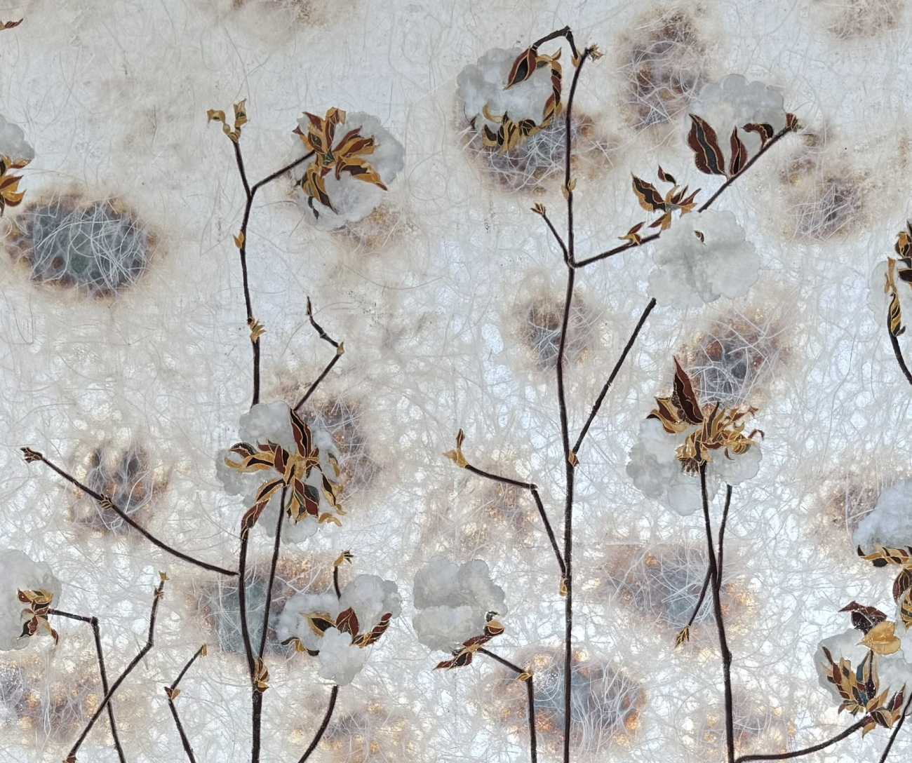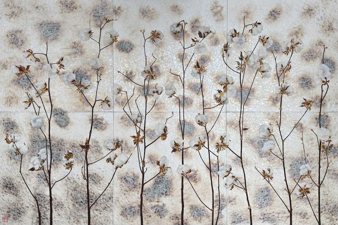 米国南部の収穫前の綿花の様を描きました。銀箔で無機的な宇宙観を、焼いて赤みを帯びた部分は大地の赤土の匂いを表現しました。重ねた阿波和紙は麻の繊維が入っており私の綿花への気持ちと融合しました。綿の部分には岩胡粉や岩白、茎と葉の部分には黄土や代赭を用いました。私の人生経験と日本画の融合がここに視覚化されたものと祈ります。
