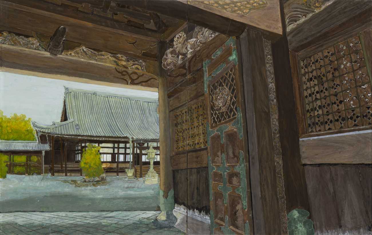 どういうイメージを持つか、配色は何色系統にするか、三門となれば、材木が中心になる。焦げ茶色かねずみ色系になってくる。暗いイメージを避けたいため、空気感を入れて門の中に大通寺を入れて明るさを取り戻す。おおむねの構想は出来た。ただひたすらに筆と絵具との挑戦となった。