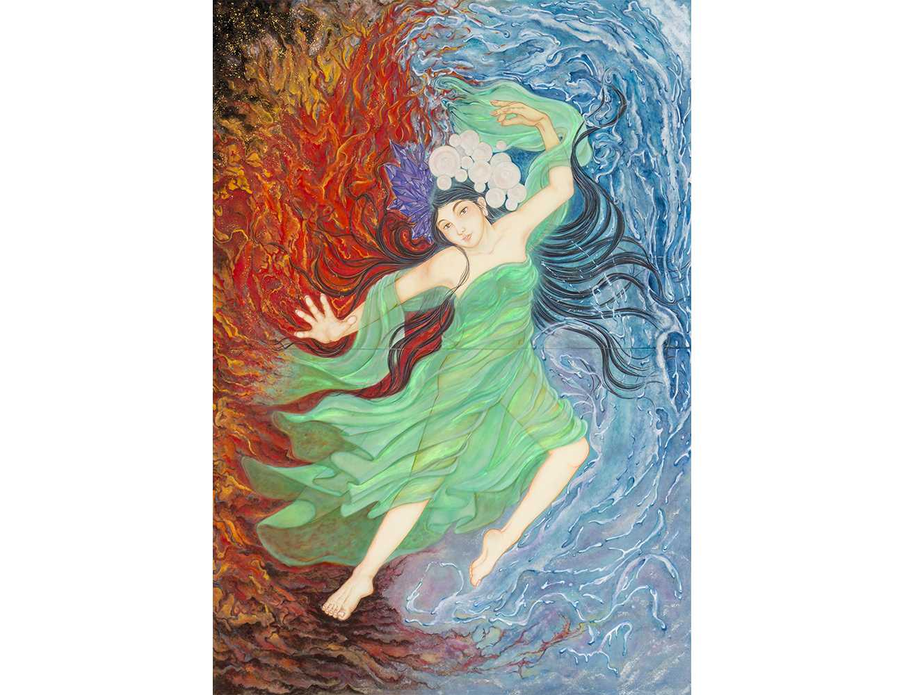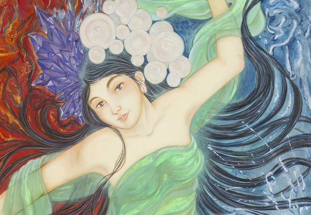 神の精力や浄化の力を借りて我を知る、薄い衣は得た知恵それを纏い時に地に足をつけ、時に軽やかに跳ね、経験と思いの融合、相反する物全ては混ざり合うのではなく融合する事で双方の力が強くなり、我を輝かせる、暗闇に迷い込んだ時、身に付けた衣が光放つ、誰しもがこれら全てを得ている、持っている。