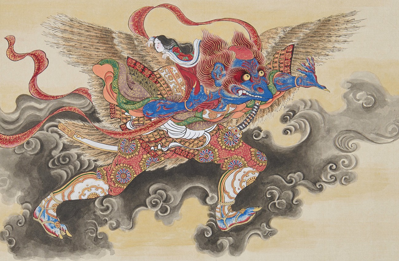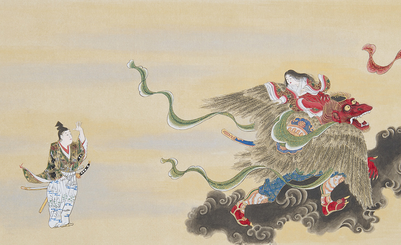 「浄瑠璃物語絵巻」は源義経と浄瑠璃姫の悲恋物語で、本場面は義経が浄瑠璃姫と侍女を大烏天狗と小烏天狗に乗せて実家に送り届ける場面です。遠くから見つめ合う二人の姿が大胆な構図と鮮やかな色彩で、強い絆として表現されて大変印象的です。岩佐又兵衛はこれ以降会うことのなかった二人の最後の場面をドラマチックに演出したのです。