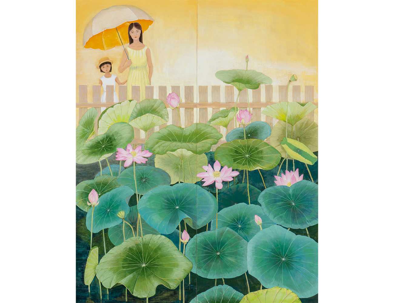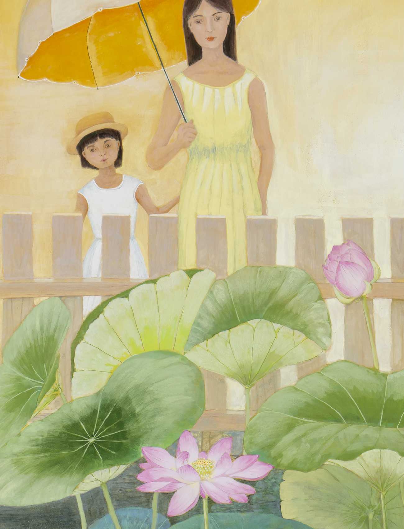 題材を探していて出会った、野洲市銅鐸博物館にある古代ハス(大賀ハス)です。早春から夏の終わりまで写生に何度も通いました。静かな公園ですが、開花期には鑑賞に訪れる方々でにぎやかです。大きく美しい花に驚きの声があがります。そんな夏の1日を描きました。