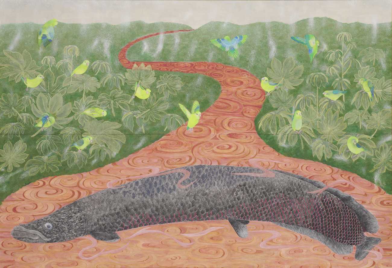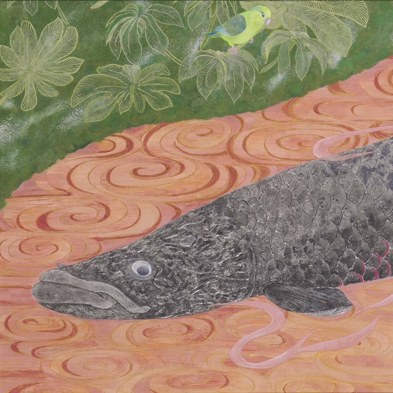 地球生態を継承・天然美の享受を継承・日本画の継承…流れを繋ぐ・生命継承の力・偉大な遺産継承が悠久であれ。南米アマゾン支流では、大規模森林伐採がオゾン層を破壊する傍ら、古代魚最大淡水魚ピラルクーは絶滅に瀕したが保護され繁殖。森林伐採後にヤツデグワが森を再生しようと直ぐに蔓延る。そこに最小インコ、ちび恐竜マメルリハが集う。