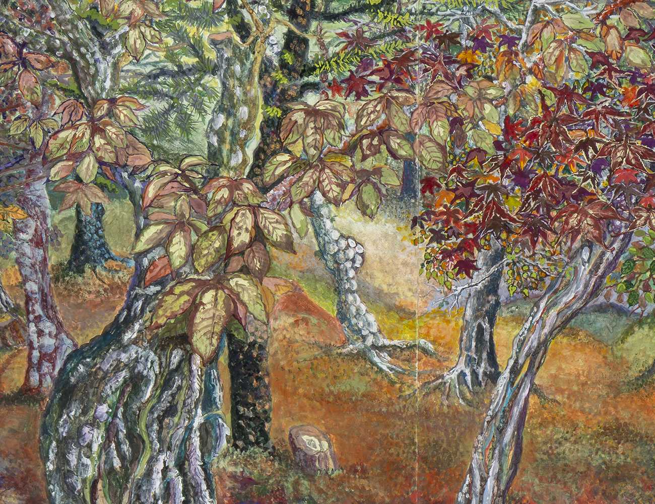 肥沃な大地に広がる晩秋の森では、樹木は華麗で色彩豊かな衣装を纏い、独自の言語能力を生かした、たおやかな会話が響き合う。樹木が笑うたびに葉を落とし、新たな大地の糧となる。