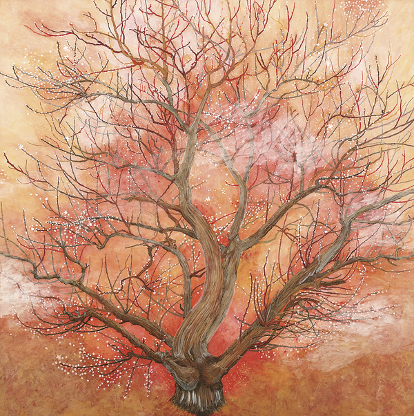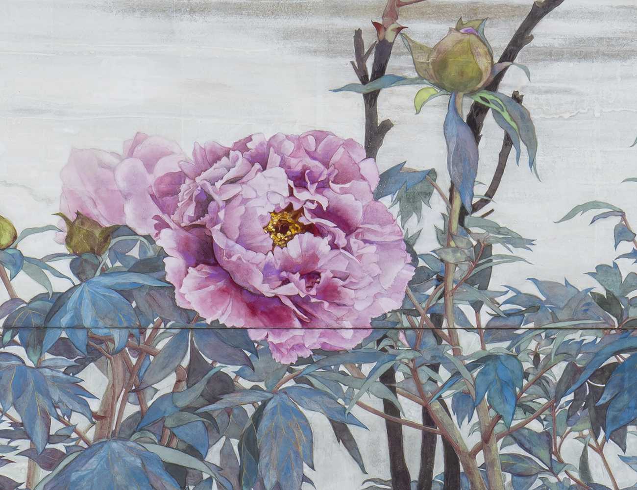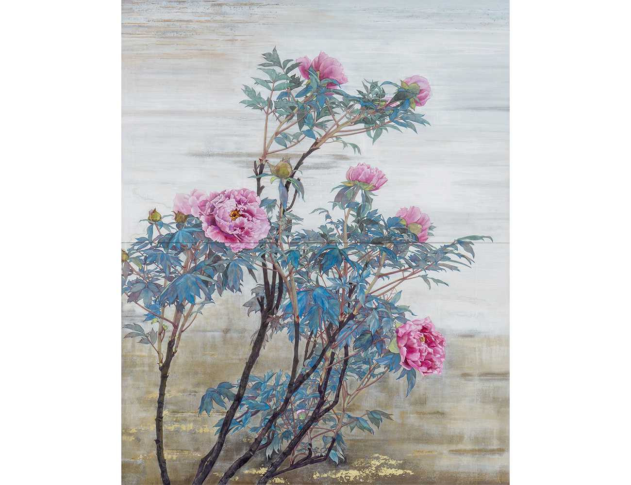 自宅の庭に20年前から毎年咲く牡丹を描きました。生命力あふれる枝の伸びやかさと、花の儚さを表現し、揺れる花の不安定さや葉や枝の自由な形の面白さを引き立てることを目指しました。