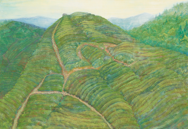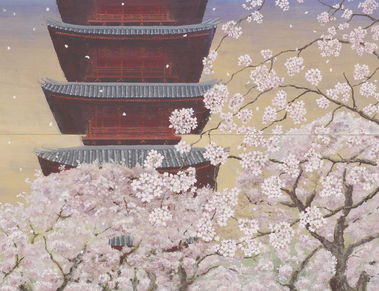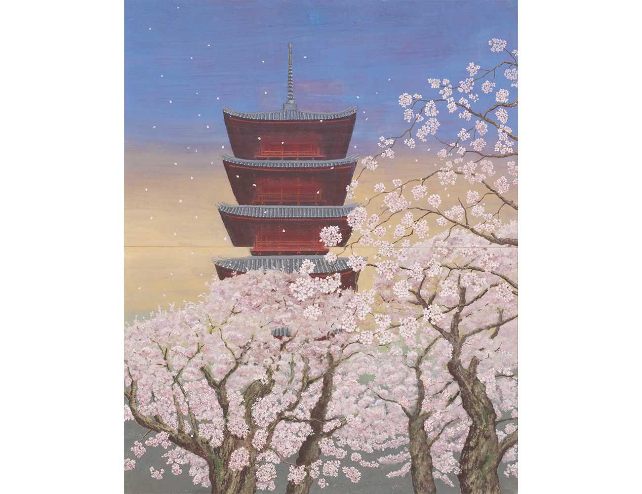 近くの池上本門寺の五重塔と桜。建築物と自然の桜という対照的な取り合わせのマッチングと桜が満開の時期の華やかさを描きました。