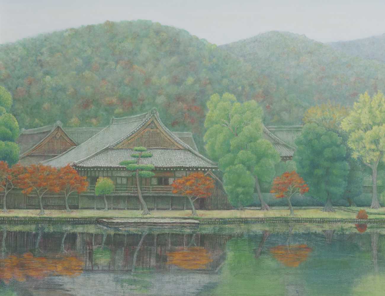 大沢池から望むこの景色は私の京都観光のお気に入りの場所のひとつです。嵯峨野中心部の混雑をよそにいつも静かな空間でした。しばらくたたずむうちに時空を超えて平安の御代の人達とこの美しい景色を共有している感覚になりました。千年を超えてここを維持してきた方々に感謝し未来永劫続くことを祈り描きました。