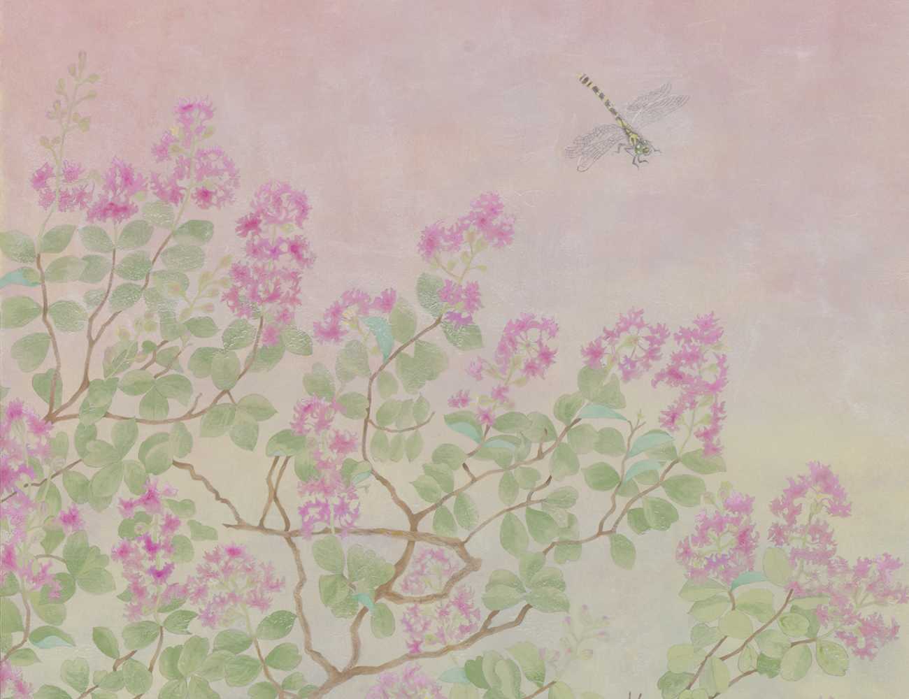 毎年楽しみにしている、我が家の近くの百日紅。木陰ではオニヤンマがひらひらと舞う。その美しい姿を心のままに描いた。力強い生命力溢れる百日紅の姿を通して、夏の暑さを乗り越えるエネルギーを感じていただけたらと思う。