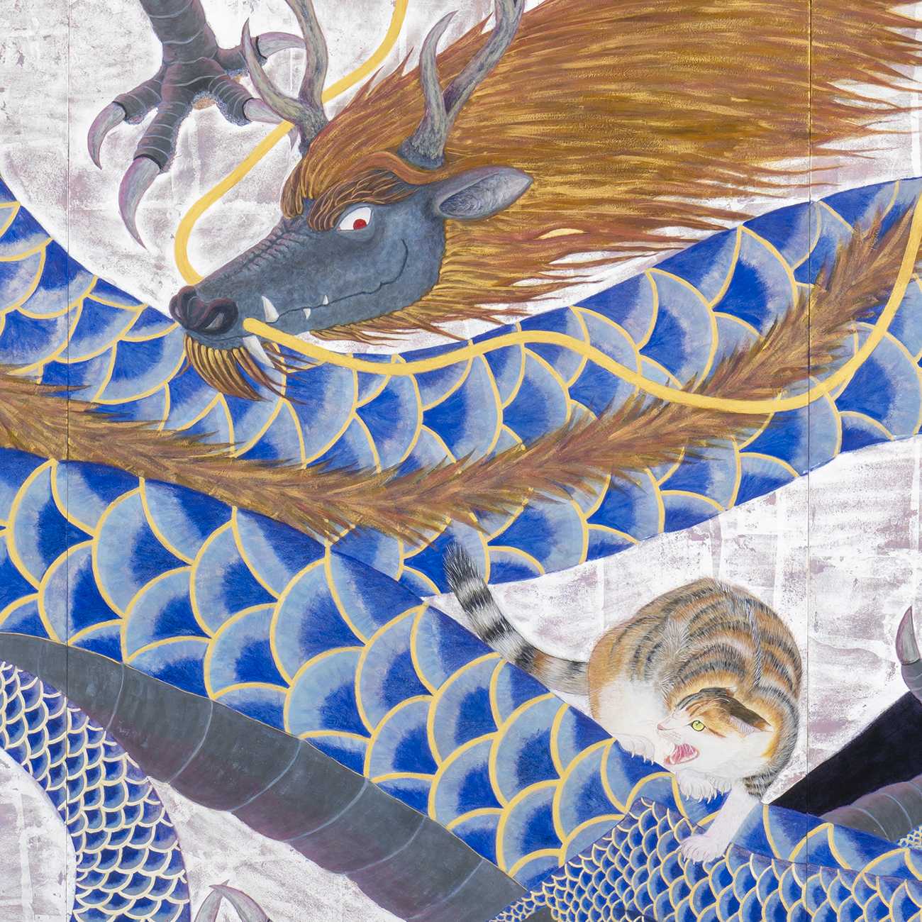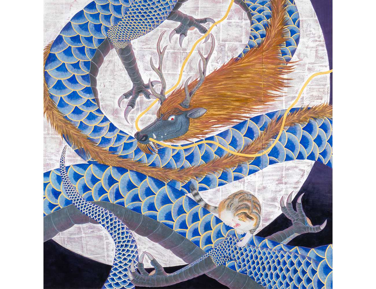 龍と猫を題材としたストーリーを考え、その一場面を切り取り描いた。昔話では猫はネズミに騙され、十二支になれなかった。その恨みを晴らすため十二支に挑んでいく。まずは龍から。猫は龍の逆鱗に触れてしまうのだろうか。それとも十二支の座を奪還することができるのだろうか。この作品から私の「十二支と猫」シリーズへの挑戦も始まった。