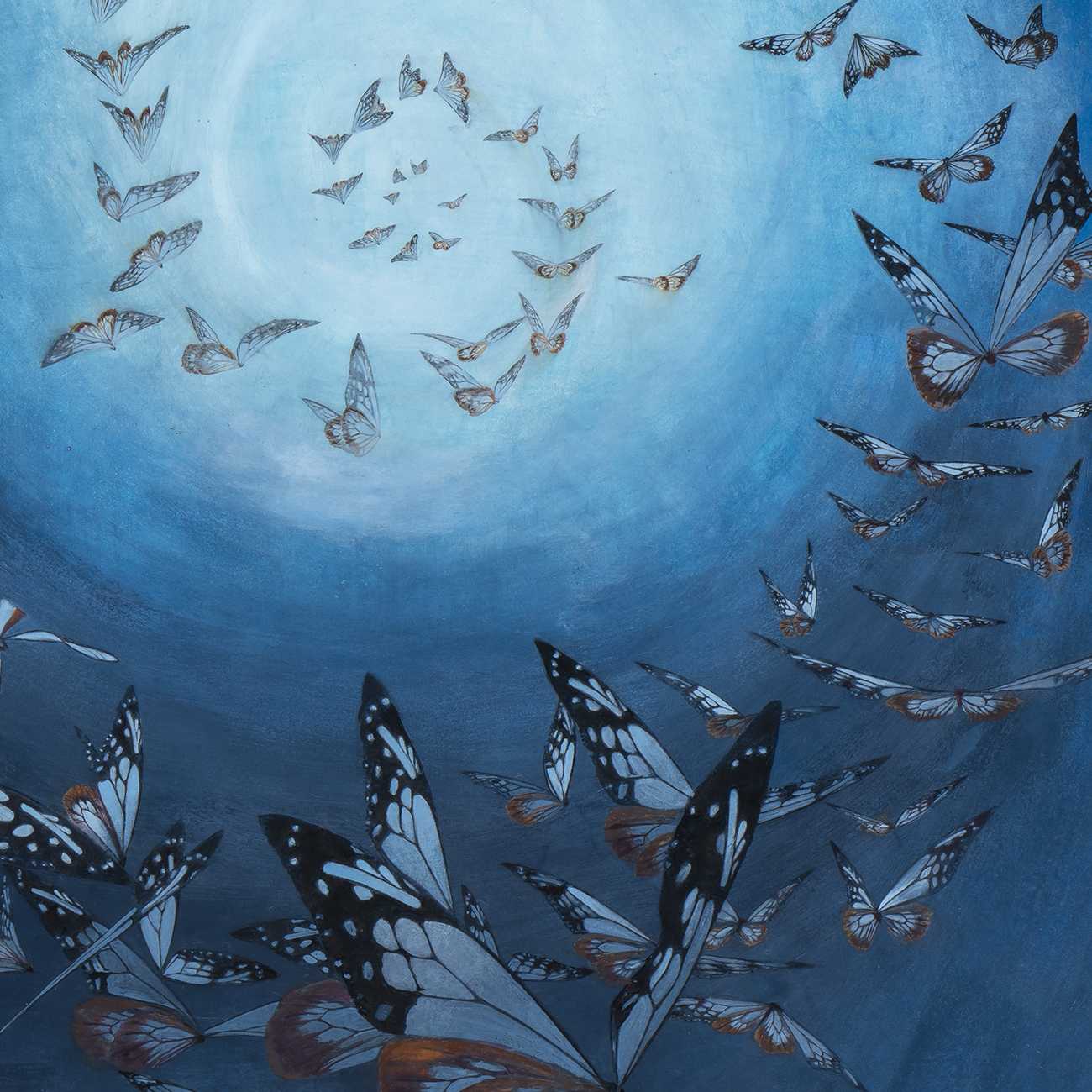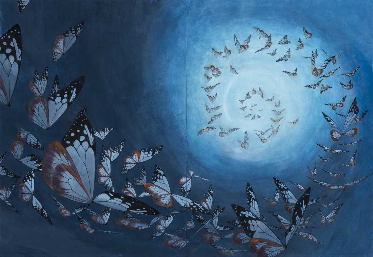 地球の生命体のなかで蝶類の歴史は長い。アサギマダラは、大陸や琉球弧から切り離されて「海を渡る」ことに適応した。個々から「集団」となったとき、賢く巧みな直感が働く特殊な性質により現在に生き延び、吉祥の未来になろうとしている。一方では、直感力と知性をもちながら無用な争いを繰り返す人類はどこに向かおうとしているのか。