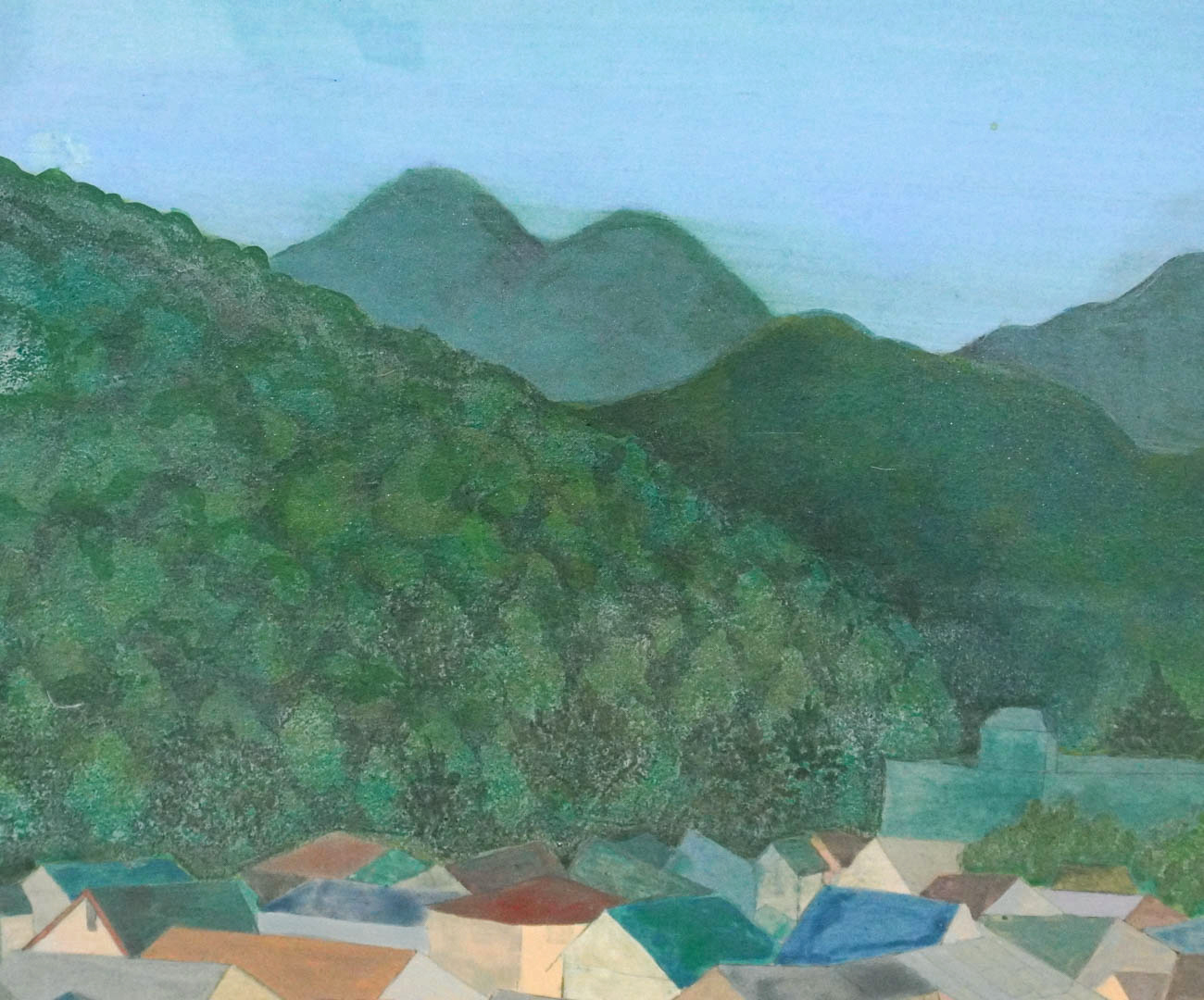 我が家のベランダから見える景色です。家並みの背後に広がっているのが世界遺産に認定された古墳群のひとつである「応神天皇陵」、その後ろに二上山、さらに葛城山へと続いています。万葉の時代からここに存在した御陵や山々の前に、現代はカラフルな人家が並んでいるギャップが面白くて、この題材を選びました。