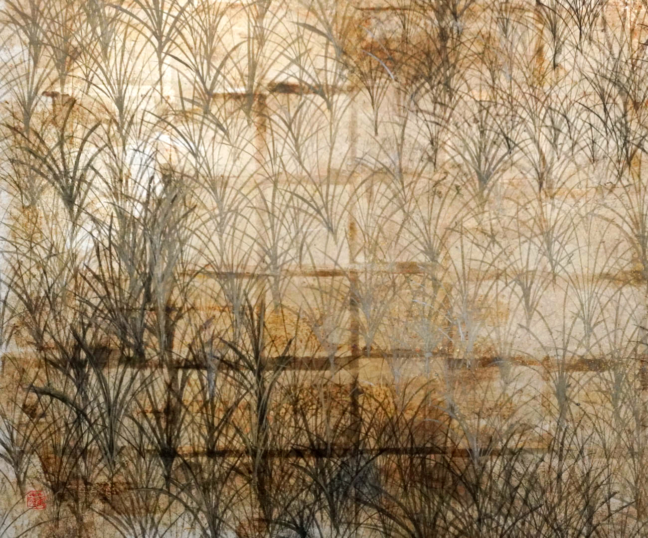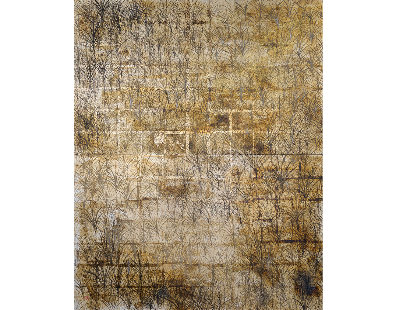 鈴木其一の芒野図屏風は二曲一隻の銀箔地に銀泥と墨を使い描かれたとされている。この作品のオマージュとして100号の割パネルを横画面に配し、縦二面、横二面、一面ずつでも鑑賞が可能なように仕上げた。銀箔地は硫黄で変色をさせ胡麻油墨と水晶末に金パールを混ぜた墨のグラデーションで描いた。