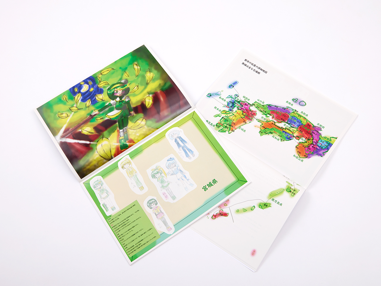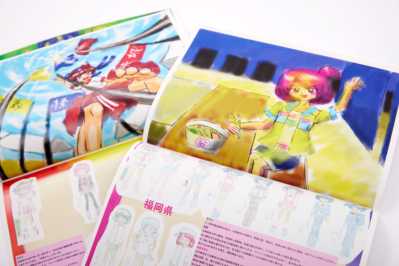 主人公が写真を撮った設定で構図や世界観にこだわった県のイラストはパソコンでかいて(上のページ)、主人公が色鉛筆でかいた掲示板という設定の都市のキャラクターの紹介は色鉛筆でかきました(下のページ)。