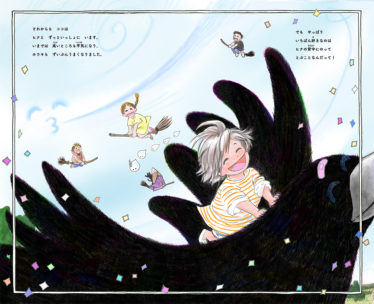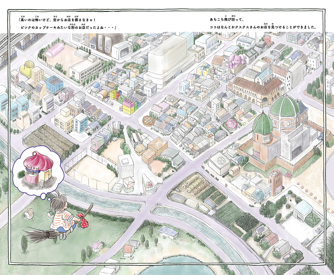 魔女の子ココちゃんが、苦手なホウキに乗って、はじめてのおつかいにでかけます。