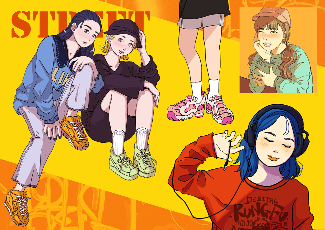代わりに、自分らしくファッションを楽しむ女の子たちに表情で語ってもらい、シャッターを切る感覚で描きました。それぞれ、価値観・好きをどう表現するかは異なりますが、彼女たちは皆、自分の大好きなスタイルに身を包み、のびのびとポーズを取っています。