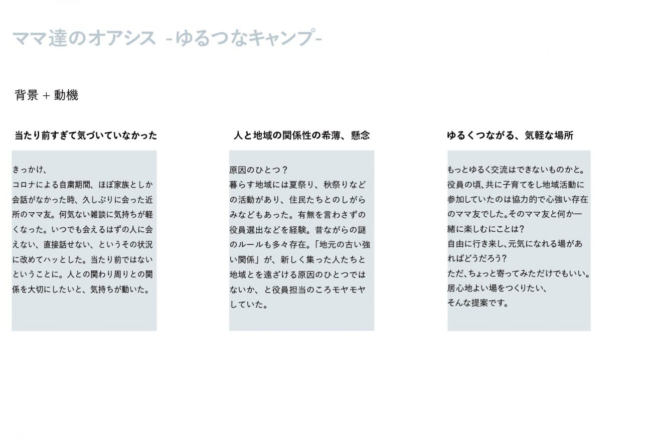 何か共にすることで話題ができ対面でのコミュニケーションのきっかけにもなる。近所と寄り添い心地よく暮らす日常があるといい。家庭や職場・学校以外の第3の居場所「サードプレイス」が幸せにつながるという。心身とも健康でいるための気軽な交流のしくみ。ゆるくつながり続ける居心地よい場をゆるーく一緒につくっていきたい、そんな提案です。