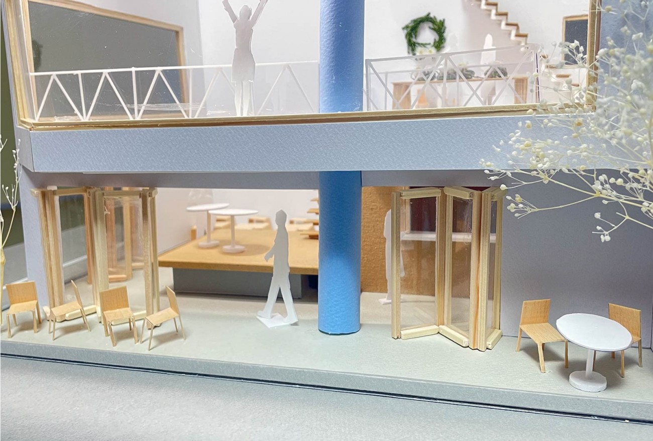 1F オープンフリースペース。 敷地全体を空間の一部とし外と内を区切らず一体としたフリースペース。フォールディングドアで壁の移動が可能。スペースを広く使えて季節のイベントやマルシェなど開催できるスペース。テーブルや椅子を置きご近所さんの休憩場所なるといい。