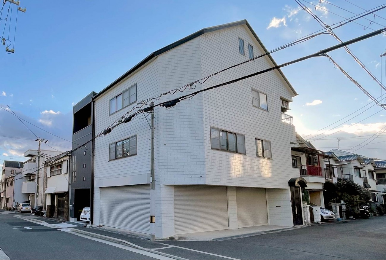 現地提案場所、大阪市鶴見区。自身が務める会社3階建て事務所の1F、2Fのスペースを活用。外観、最高高さ11,600mm、写真左の東側道路は南へ一方通行。