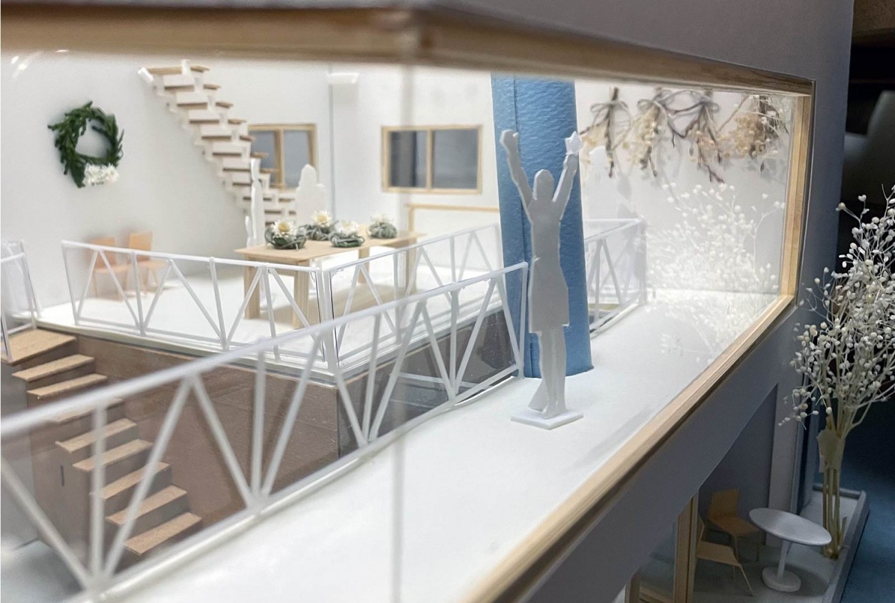 2F ギャラリースペース。現在のシャッターと外の軒うえのためそのまま2Fの床としてギャラリースペースにした。ワークショップ作品や子ども達の絵など展覧できる多様なフリースペースとして開放する。