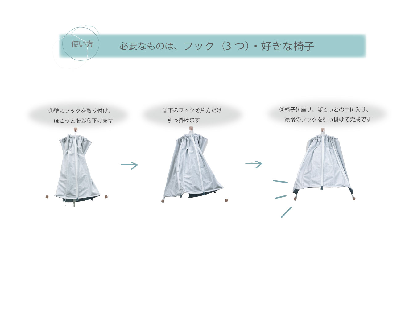準備してもらうものは、座りたい椅子と壁につけられるフック(3つ)だけ。 使用方法も簡単です。