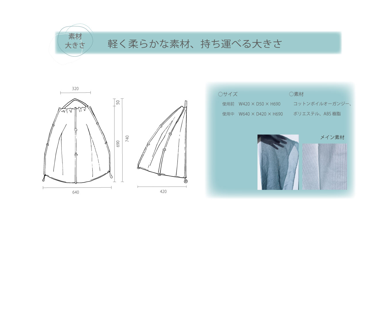 重さはもちろん、見た目の軽さ・柔らかさを考えてメイン素材をコットンボイルオーガンジーにしました。また、遮光遮像レースカーテンを合わせることで程よく光が入らず、人の目を気にすることなく使用できるようにしました。