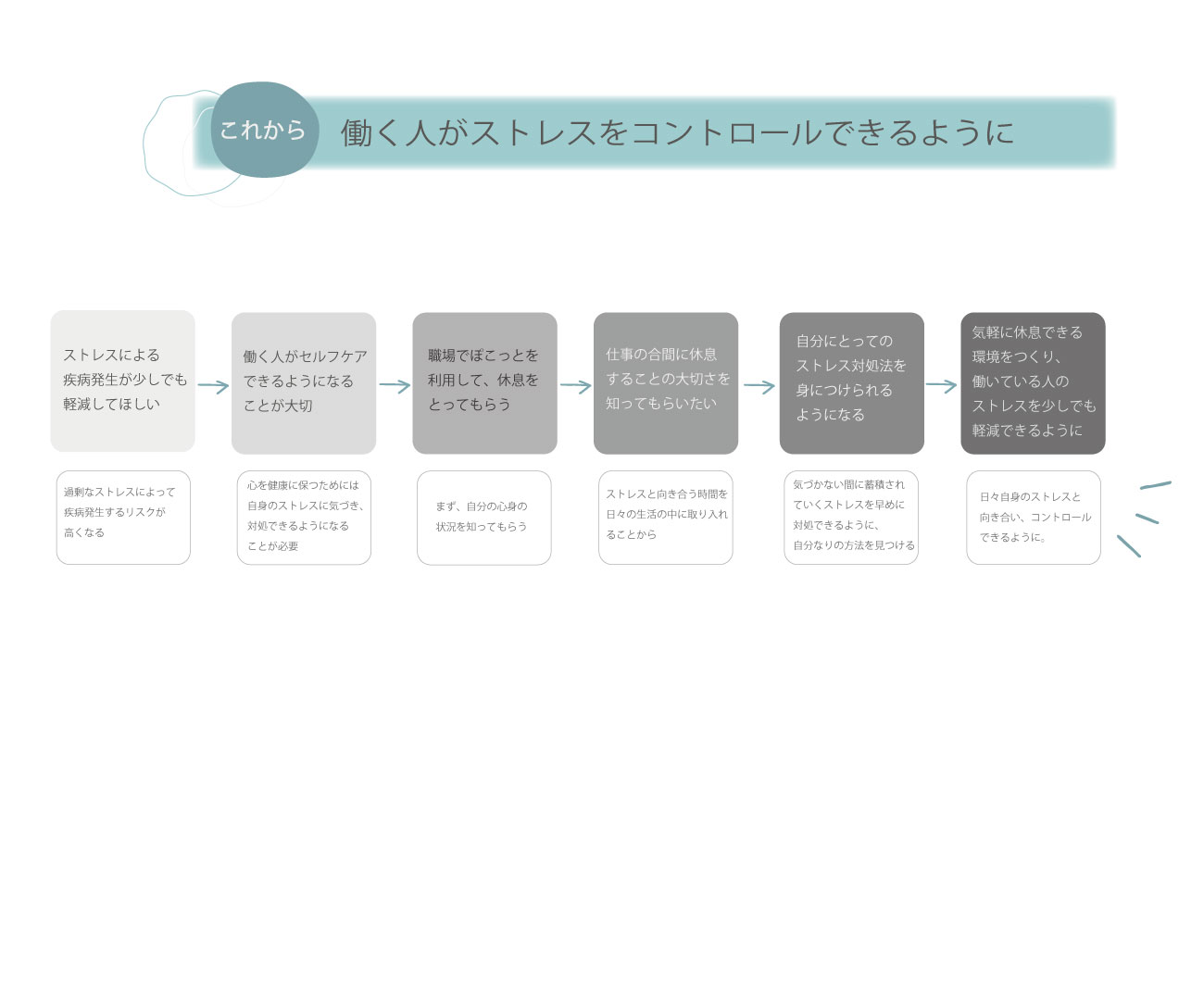 この作品を通して、職場でしっかりと休息をとることの大切さを知り、セルフケアすることで自分自身のストレスをコントロールできるようになってほしいと考えています。