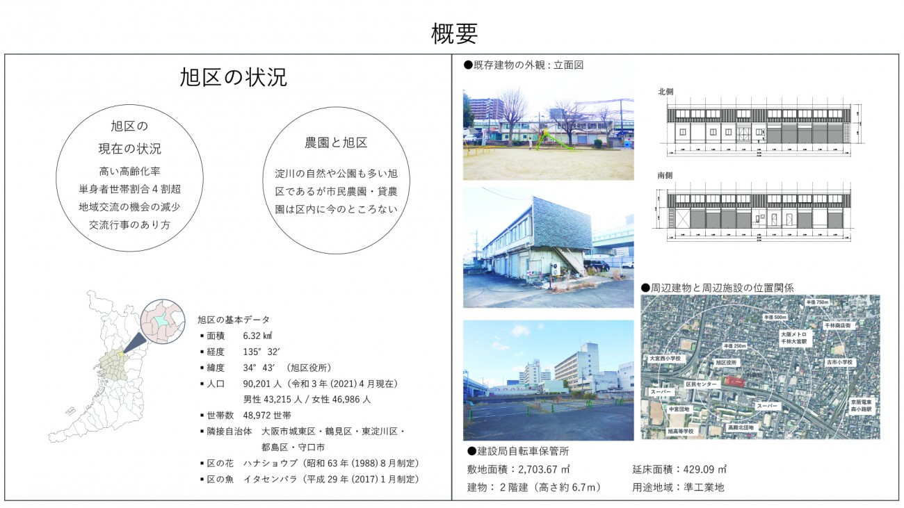 本制作では、旭区内にある建設局自転車保管所を本制作の計画地として設定、現在ある建物をリノベーション計画と敷地の利用計画を行いました。